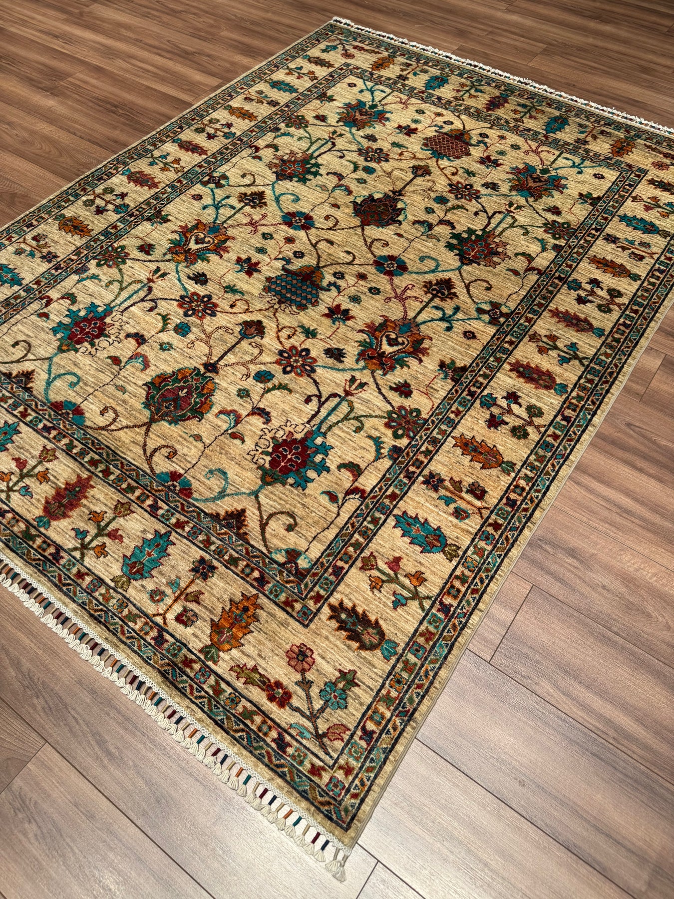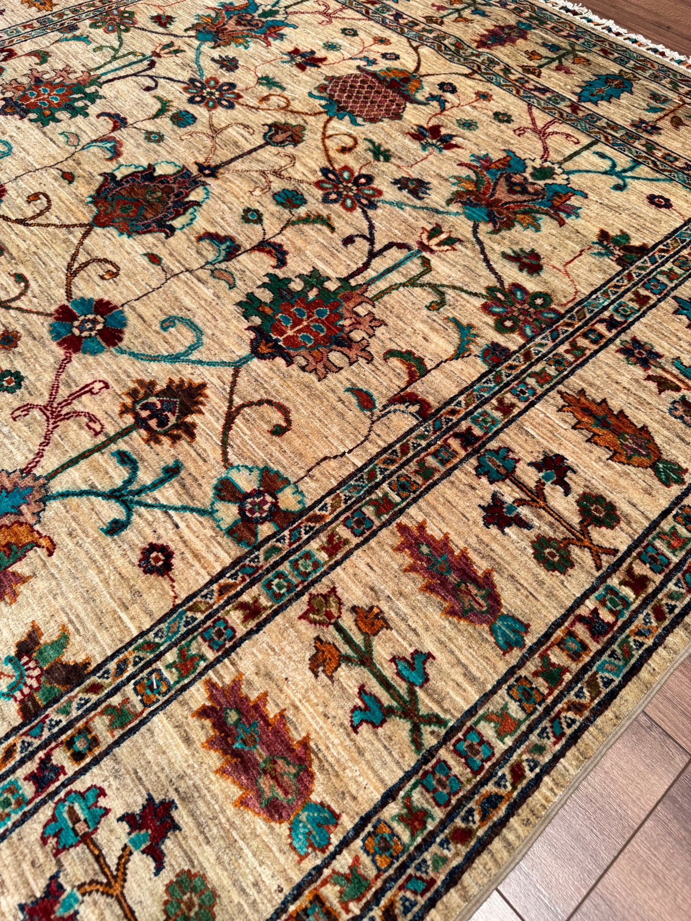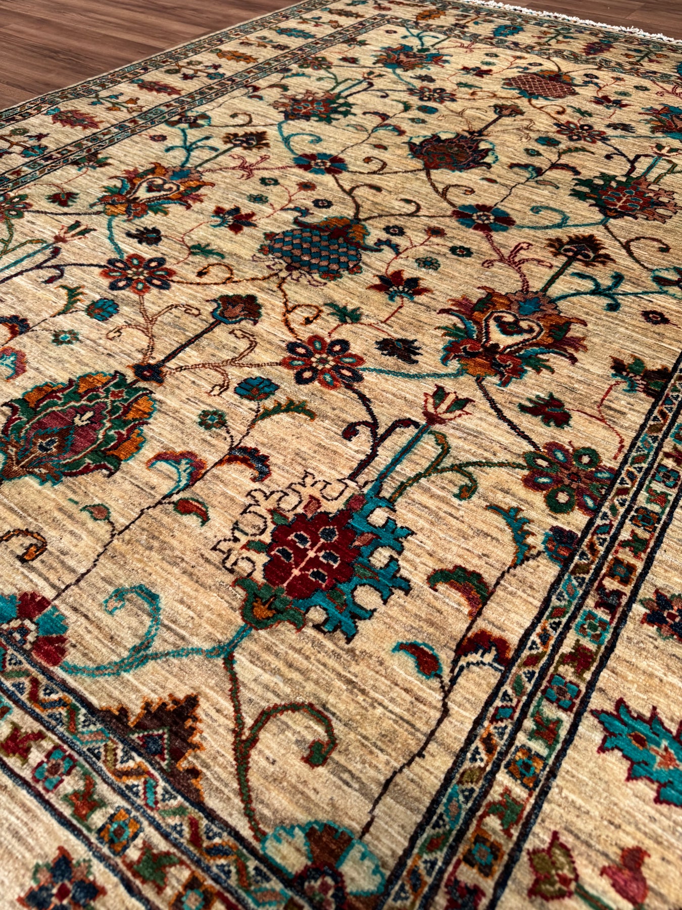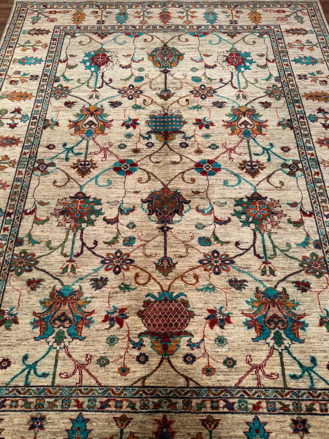 السدى واللحمة لهذه السجادة مصنوعان من خيوط قطنية. الخيوط نفسها مصنوعة يدويًا بالكامل باستخدام صبغة طبيعية. خيوط الصوف المستخدمة في العقد مصبوغة بأصباغ الفوة، أي مواد طبيعية. على سبيل المثال، للحصول على اللون الأحمر، تُغلى خيوط الصوف مع بتلات الورد، التي تأخذ لون بتلات الورد؛ وتُسمى الخيوط المصبوغة بهذه الطريقة خيوط مصبوغة بالفوة. تصبح السجاد المصنوعة من خيوط مصبوغة بالفوة أكثر لمعانًا مع الاستخدام. علاوة على ذلك، تُعد هذه السجادة سجادة عالية الجودة من حيث كثافة النسيج، حيث منسوجة باستخدام العقدة التركية، والمعروفة أيضًا بتقنية العقدة المزدوجة. هذه الميزة تجعلها أكثر متانة ولها عمر أطول من السجاد الفارسي. وأخيرًا، تم استخدام ما يقرب من 900000 خيط معقود يدويًا في نسج هذه السجادة.