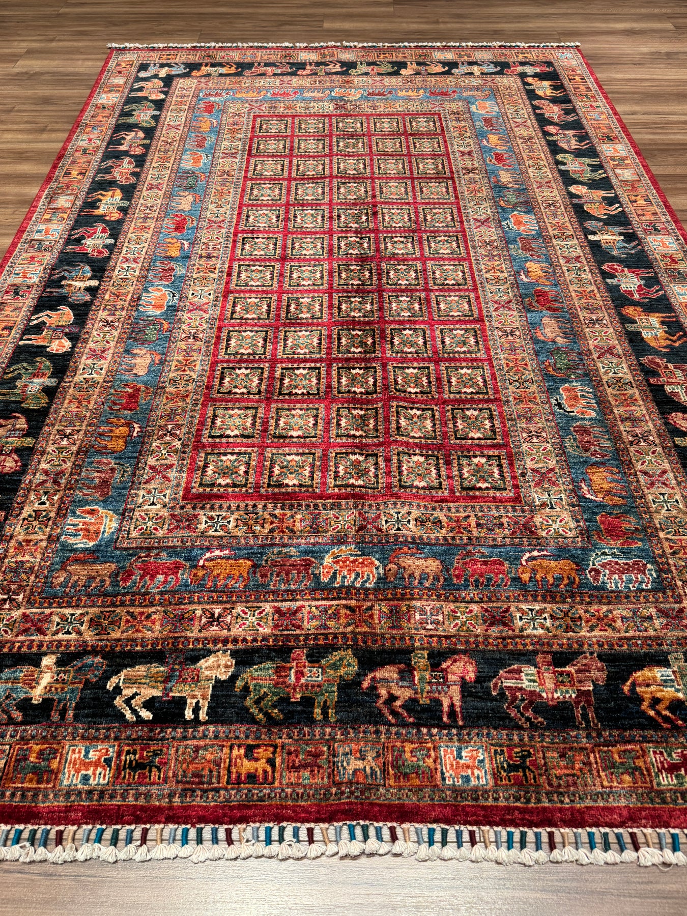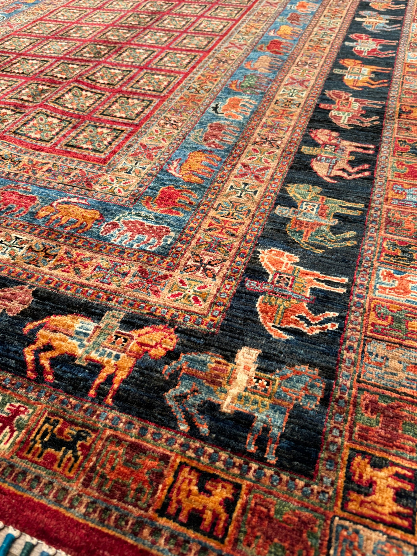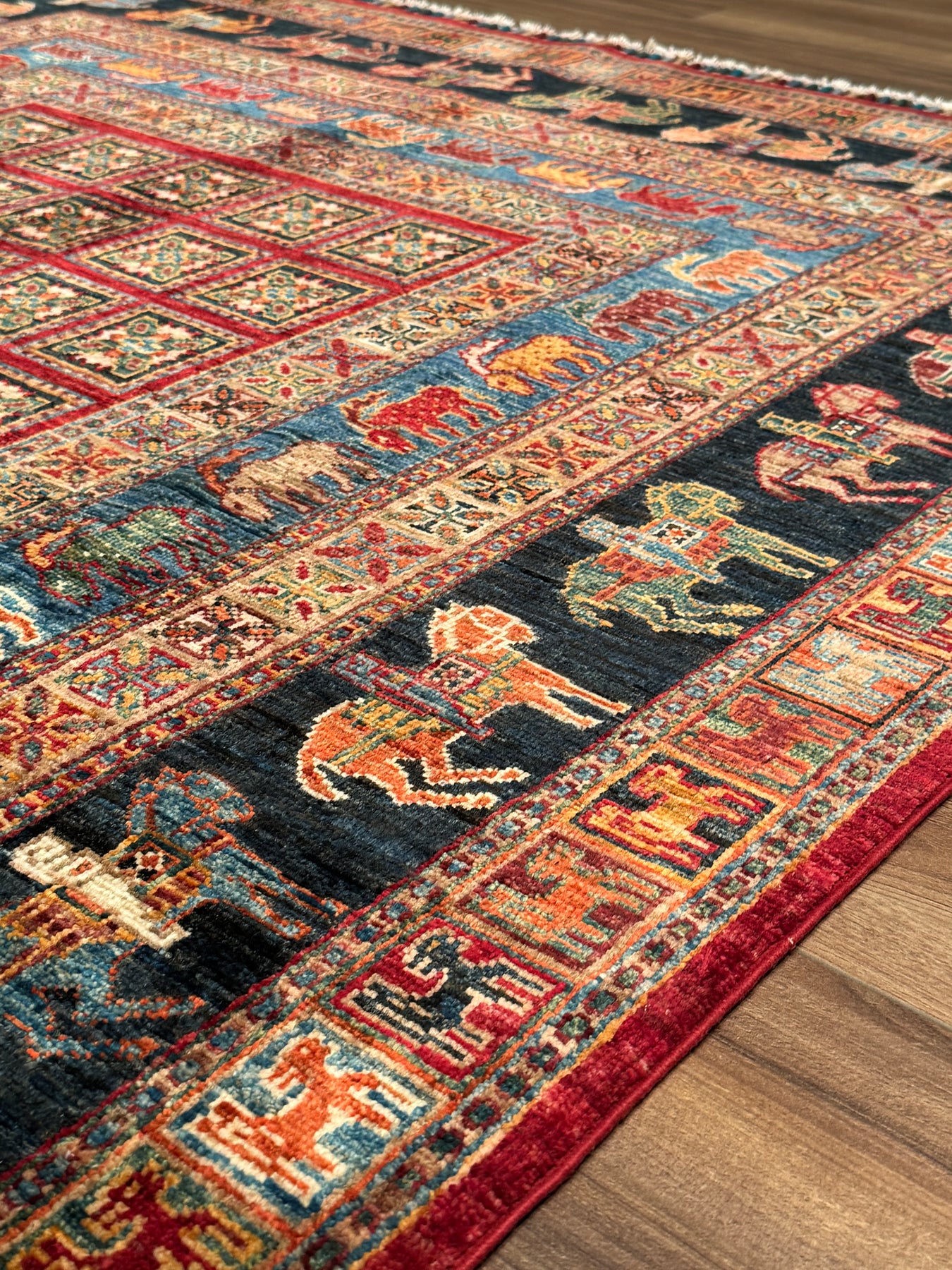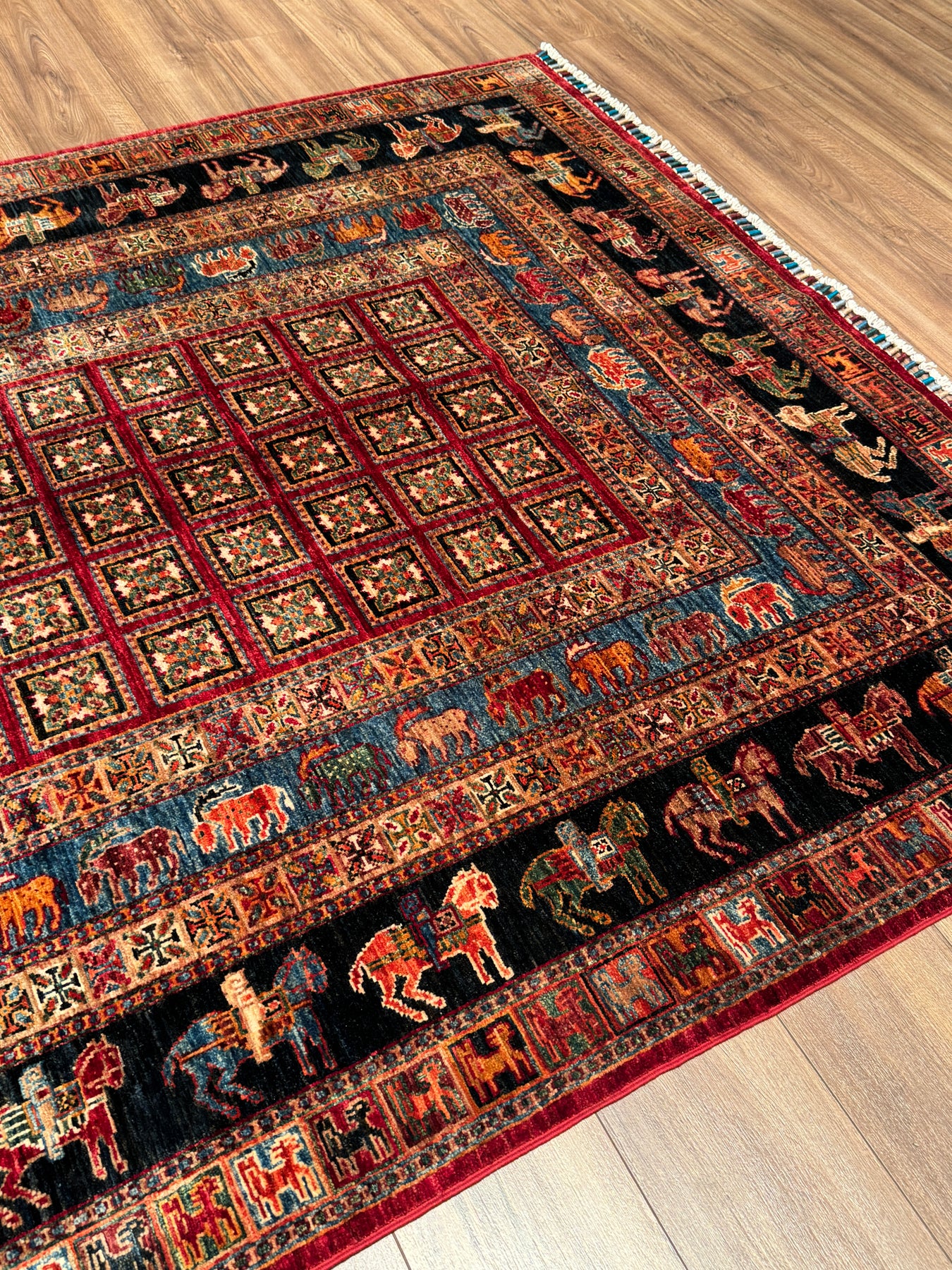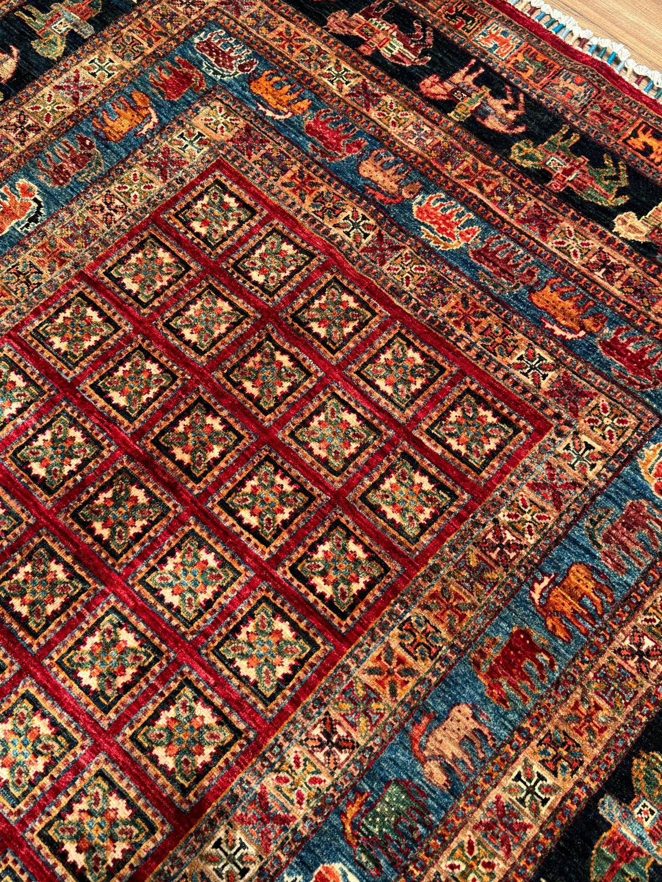 Bu halımızın atkı ve çözgüsü pamuk düğümleri yün ipliktir. İplikler de tamamen el ile kirman kullanılarak üretilmiştir. Düğümlerde kullanılan yün iplikler kök boya, yani doğal malzemeler, kullanılarak boyanmıştır. Örnek vermek gerekirse, kırmızı rengi elde etmek için yün iplikler gül yaprakları ile kaynatılır ve iplik gül yaprağının rengini alır; bu şekilde boyanmış ipliklere ise kök boya ile boyanmış iplikler denir. Kök boya ile boyanmış ipliklerden üretilen halılar, kullandıkça daha parlak bir görünüme sahip olur. Öte yandan, bu halımız dokuma sıklığı açısından üst kalite bir halı olup Türk düğümü bir diğer değişle çift düğüm tekniği ile dokunmuştur; bu özelliği sayesinde, daha dayanıklı olup İran halılarına kıyasla daha uzun ömre sahiptir. Son olarak, bu halımızın dokumasında yaklaşık 600.000 El düğümü atılmıştır.