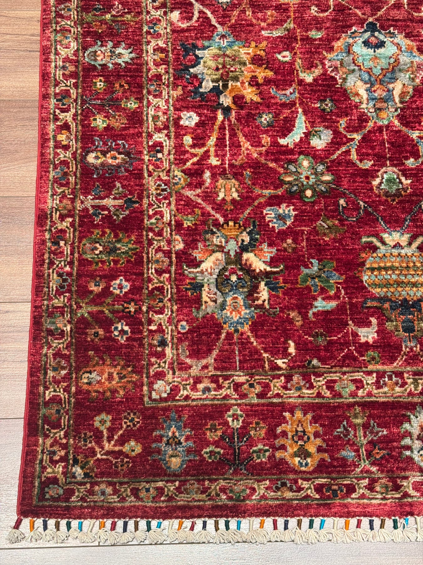 Bu halımızın atkı ve çözgüsü pamuk düğümleri yün ipliktir. İplikler de tamamen el ile kirman kullanılarak üretilmiştir. Düğümlerde kullanılan yün iplikler kök boya, yani doğal malzemeler, kullanılarak boyanmıştır. Örnek vermek gerekirse, kırmızı rengi elde etmek için yün iplikler gül yaprakları ile kaynatılır ve iplik gül yaprağının rengini alır; bu şekilde boyanmış ipliklere ise kök boya ile boyanmış iplikler denir. Kök boya ile boyanmış ipliklerden üretilen halılar, kullandıkça daha parlak bir görünüme sahip olur. Öte yandan, bu halımız dokuma sıklığı açısından üst kalite bir halı olup Türk düğümü bir diğer değişle çift düğüm tekniği ile dokunmuştur; bu özelliği sayesinde, daha dayanıklı olup İran halılarına kıyasla daha uzun ömre sahiptir. Son olarak, bu halımızın dokumasında yaklaşık 400.000 El düğümü atılmıştır.