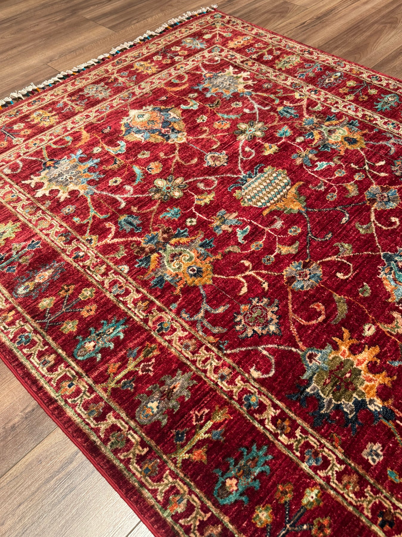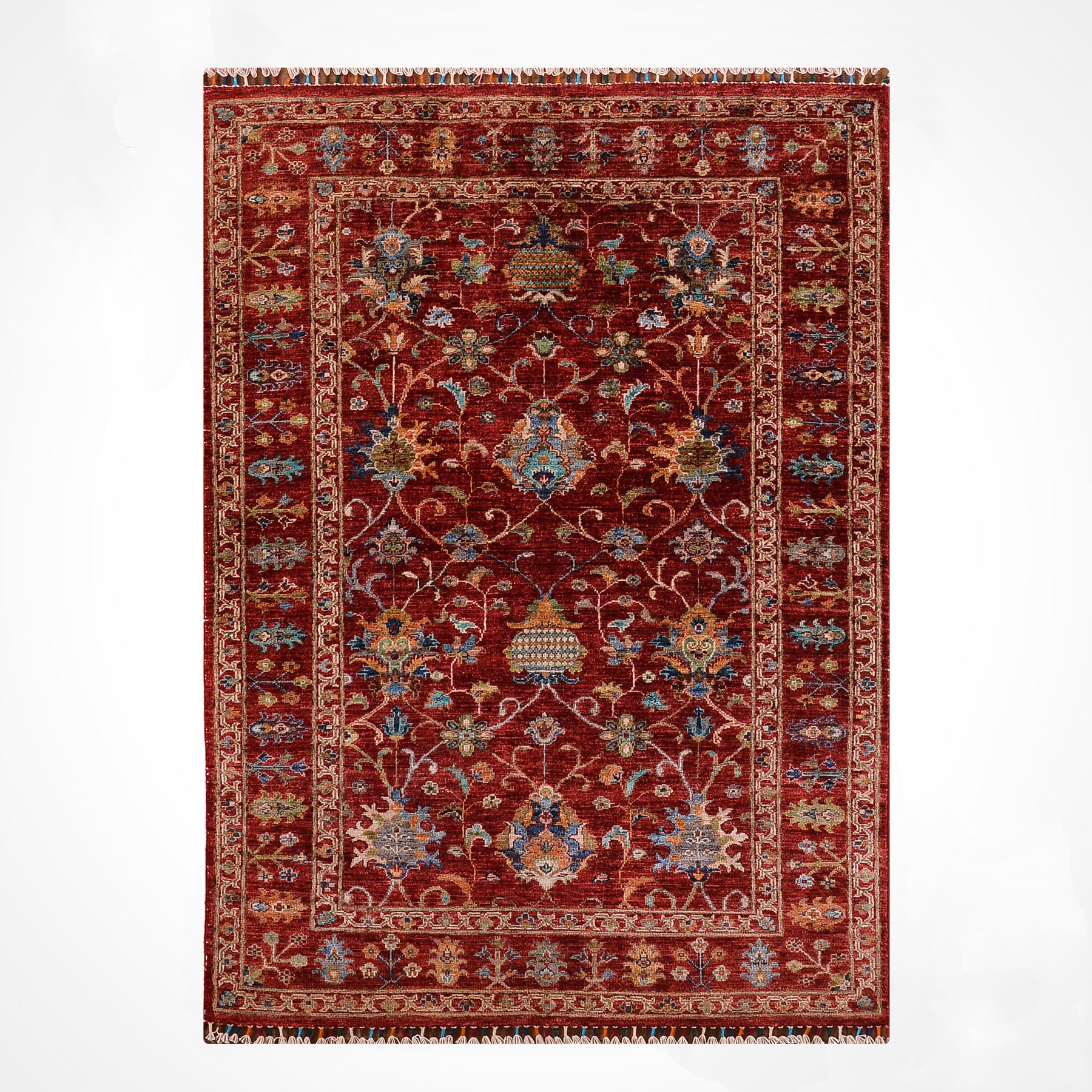 Bu halımızın atkı ve çözgüsü pamuk düğümleri yün ipliktir. İplikler de tamamen el ile kirman kullanılarak üretilmiştir. Düğümlerde kullanılan yün iplikler kök boya, yani doğal malzemeler, kullanılarak boyanmıştır. Örnek vermek gerekirse, kırmızı rengi elde etmek için yün iplikler gül yaprakları ile kaynatılır ve iplik gül yaprağının rengini alır; bu şekilde boyanmış ipliklere ise kök boya ile boyanmış iplikler denir. Kök boya ile boyanmış ipliklerden üretilen halılar, kullandıkça daha parlak bir görünüme sahip olur. Öte yandan, bu halımız dokuma sıklığı açısından üst kalite bir halı olup Türk düğümü bir diğer değişle çift düğüm tekniği ile dokunmuştur; bu özelliği sayesinde, daha dayanıklı olup İran halılarına kıyasla daha uzun ömre sahiptir. Son olarak, bu halımızın dokumasında yaklaşık 400.000 El düğümü atılmıştır.