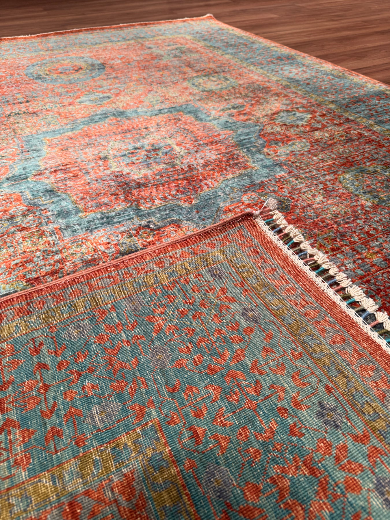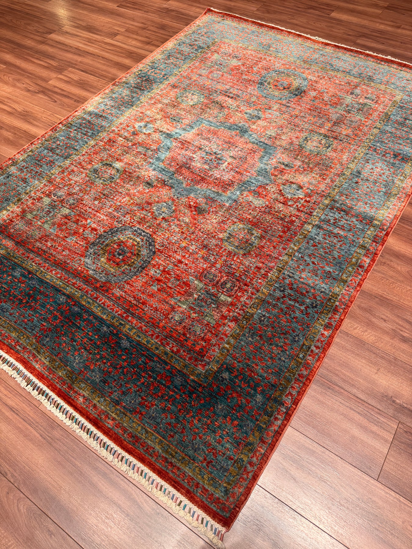 Bu halımızın atkı ve çözgüsü pamuk düğümleri yün ipliktir. İplikler de tamamen el ile kirman kullanılarak üretilmiştir. Düğümlerde kullanılan yün iplikler kök boya, yani doğal malzemeler, kullanılarak boyanmıştır. Örnek vermek gerekirse, kırmızı rengi elde etmek için yün iplikler gül yaprakları ile kaynatılır ve iplik gül yaprağının rengini alır; bu şekilde boyanmış ipliklere ise kök boya ile boyanmış iplikler denir. Kök boya ile boyanmış ipliklerden üretilen halılar, kullandıkça daha parlak bir görünüme sahip olur. Öte yandan, bu halımız dokuma sıklığı açısından üst kalite bir halı olup Türk düğümü bir diğer değişle çift düğüm tekniği ile dokunmuştur; bu özelliği sayesinde, daha dayanıklı olup İran halılarına kıyasla daha uzun ömre sahiptir. Son olarak, bu halımızın dokumasında yaklaşık 1.000.000 El düğümü atılmıştır.