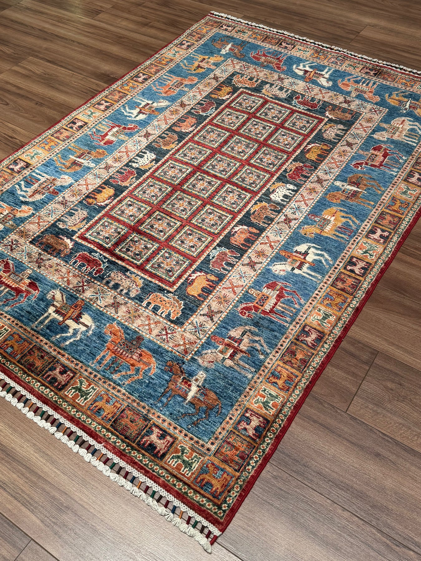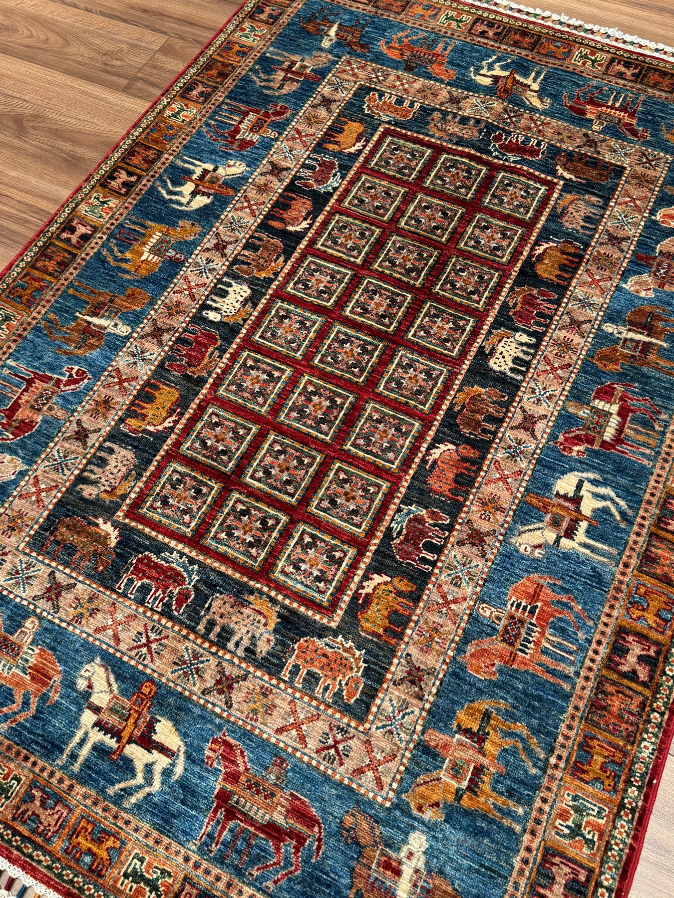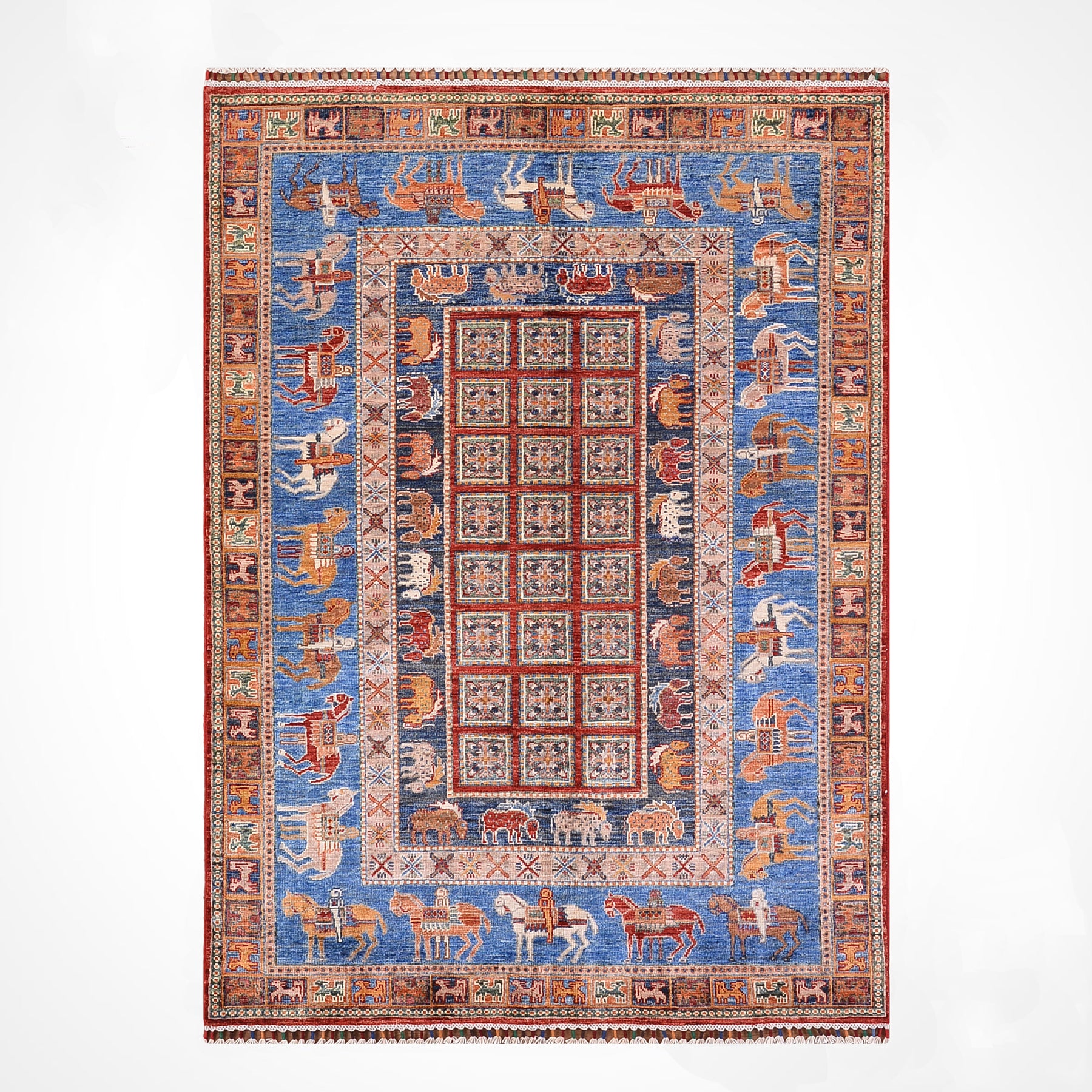 اكتُشفت هذه السجادة عام ١٩٤٩ في مقابر قبائل الهون الأثرية، المعروفة باسم تلال بازيريك، في جبال ألتاي بآسيا الوسطى، وهي أقدم سجادة تركية معقودة معروفة. تُنسج سجادة بازيريك باستخدام زخارف بشرية وحيوانية وزهرية تحمل آثار الثقافة التركية. تحتوي المربعات التي تُشكل النقوش المركزية للسجادة على زخارف نباتية رباعية الفصوص، بينما يُزين أحد حوافها العريضة صفوفًا من أتراك الهون يمتطون الخيول. وأخيرًا، يُزين الحافة الضيقة أشكال غريفين.