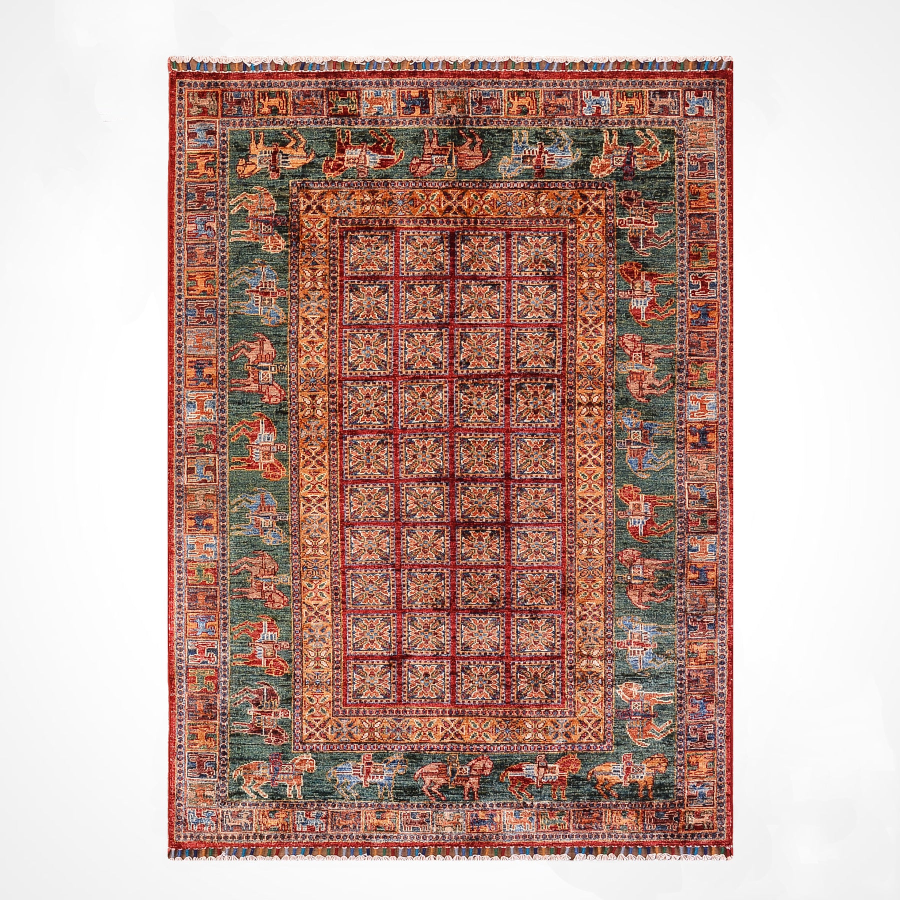 اكتُشفت هذه السجادة عام ١٩٤٩ في مقابر قبائل الهون الأثرية، المعروفة باسم تلال بازيريك، في جبال ألتاي بآسيا الوسطى، وهي أقدم سجادة تركية معقودة معروفة. تُنسج سجادة بازيريك باستخدام زخارف بشرية وحيوانية وزهرية تحمل آثار الثقافة التركية. تحتوي المربعات التي تُشكل النقوش المركزية للسجادة على زخارف نباتية رباعية الفصوص، بينما يُزين أحد حوافها العريضة صفوفًا من أتراك الهون يمتطون الخيول. وأخيرًا، يُزين الحافة الضيقة أشكال غريفين.