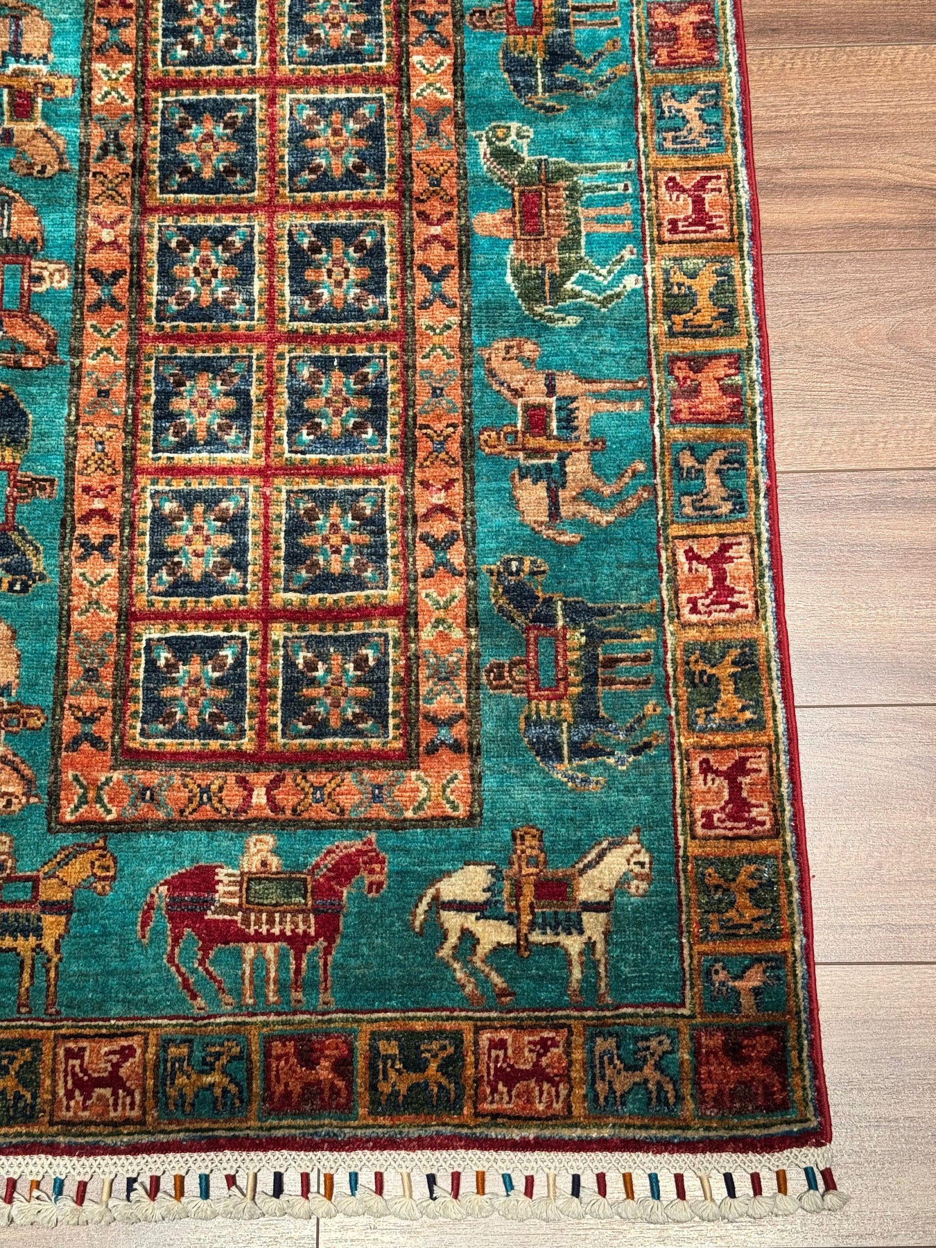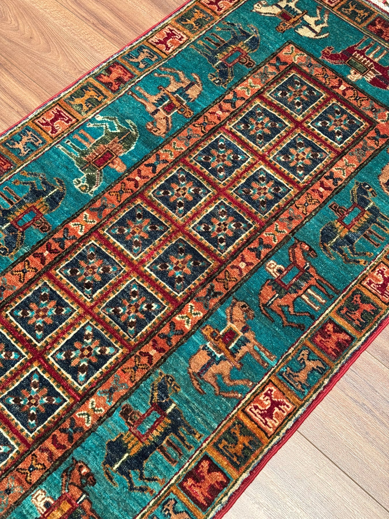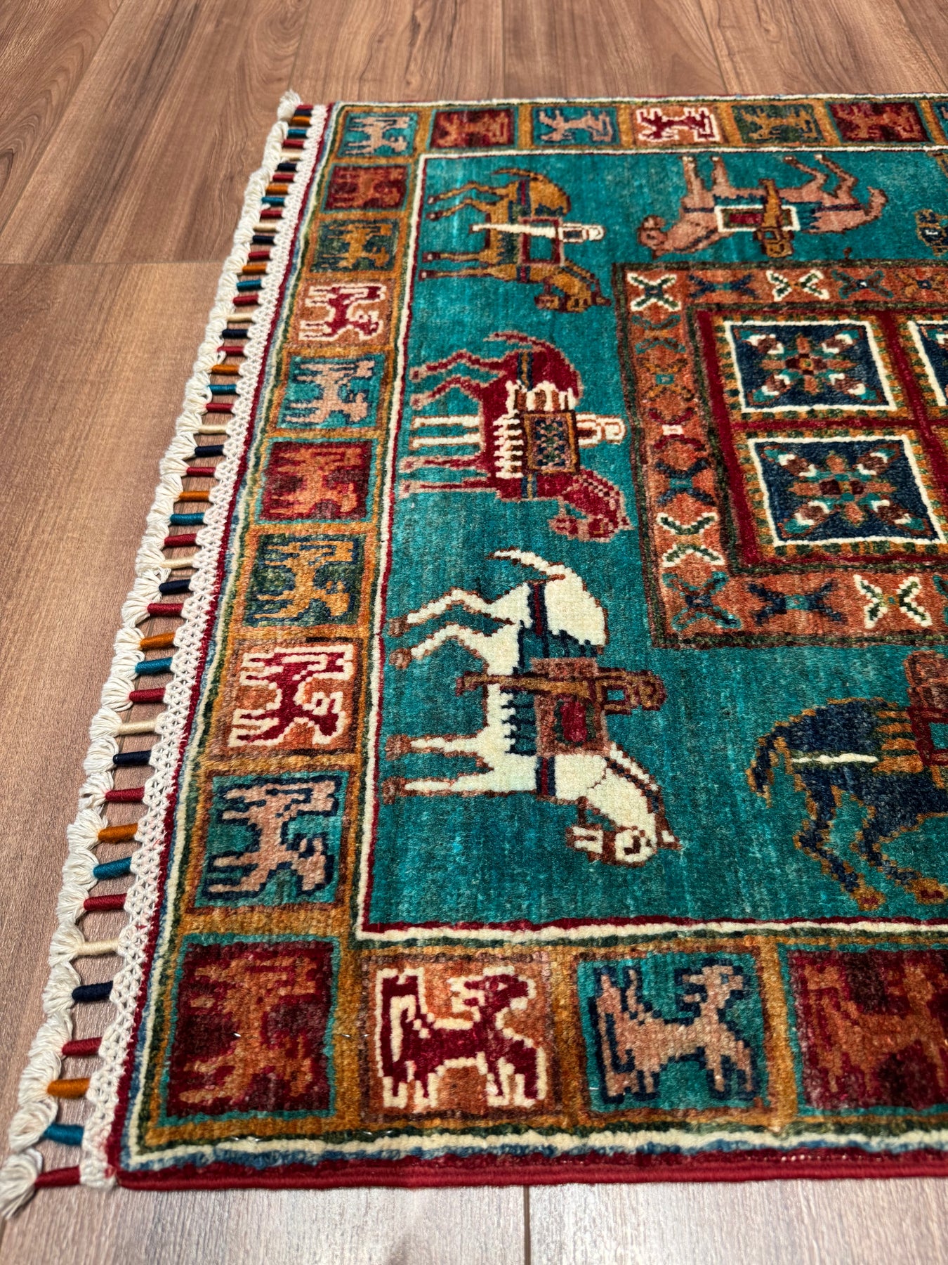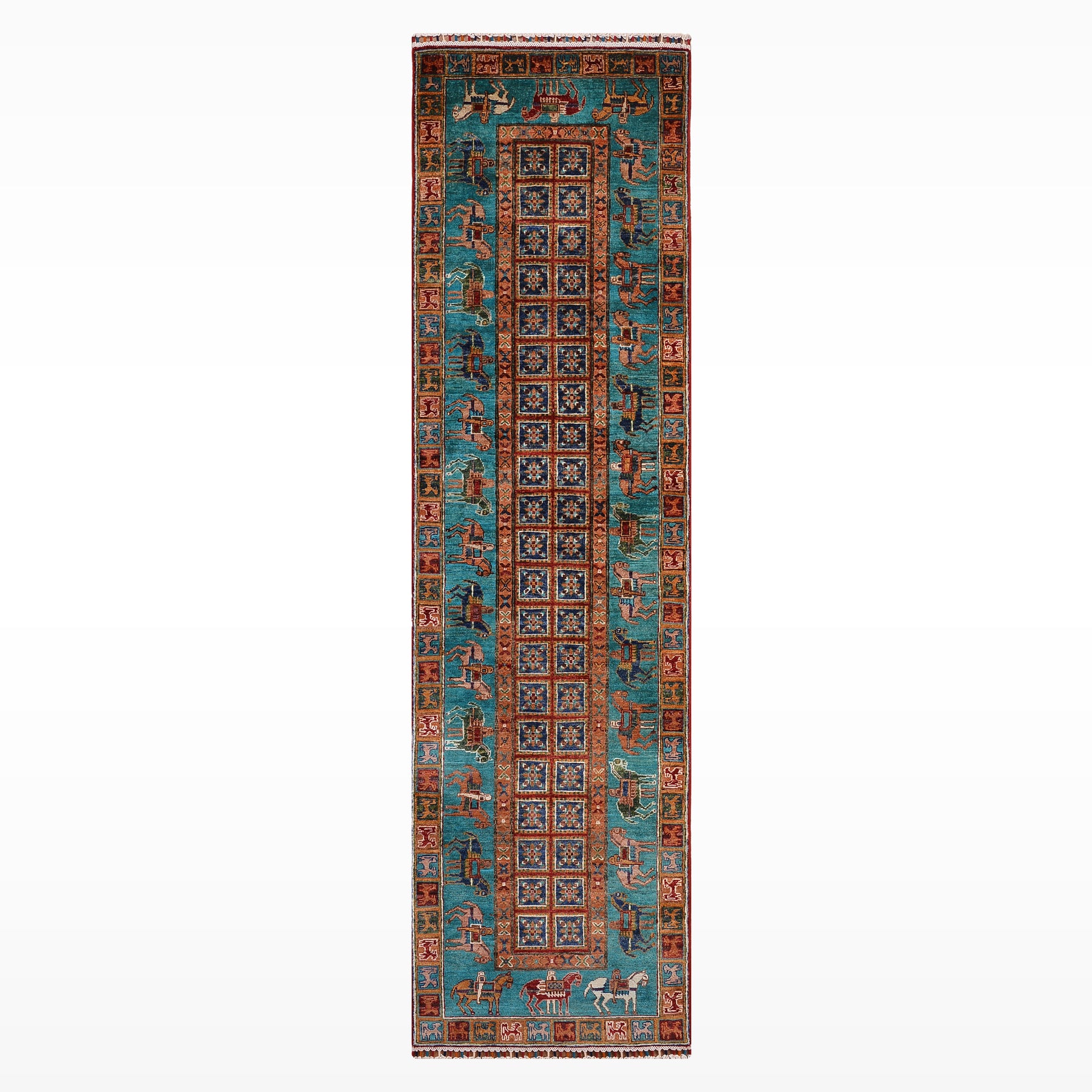 اكتُشفت هذه السجادة عام ١٩٤٩ في مقابر قبائل الهون الأثرية، المعروفة باسم بازيريك كورغانز، في جبال ألتاي بآسيا الوسطى، وهي أقدم سجادة تركية معقودة معروفة. نسجت سجادة بازيريك باستخدام زخارف بشرية وحيوانية وزهرية تحمل آثار الثقافة التركية. تحتوي المربعات التي تُشكل النقوش المركزية للسجادة على زخارف نباتية رباعية الفصوص، بينما يُزين أحد حوافها العريضة صفوفًا من أتراك الهون يمتطون الخيول. وأخيرًا، يُزين الحافة الضيقة أشكال غريفين.