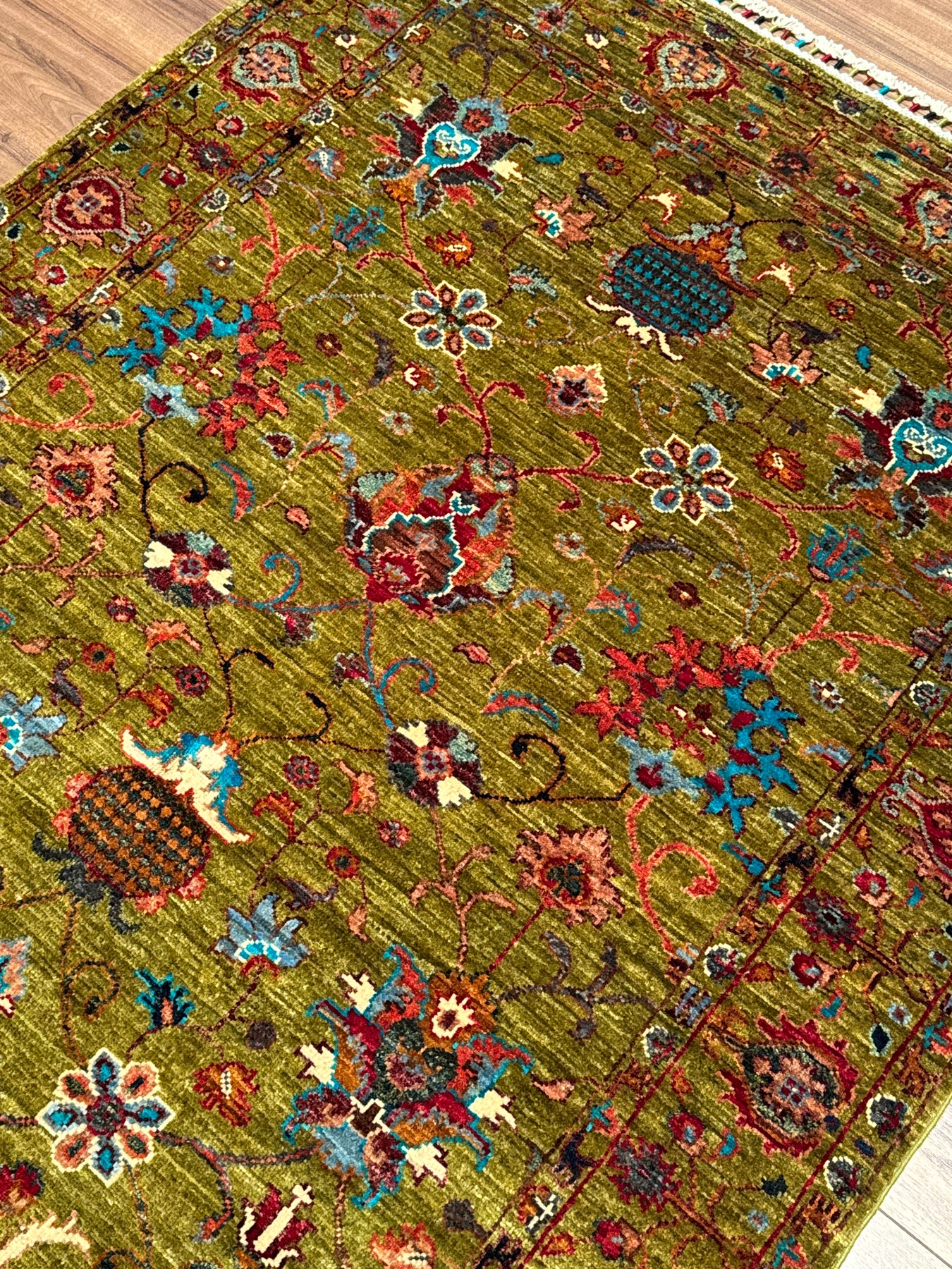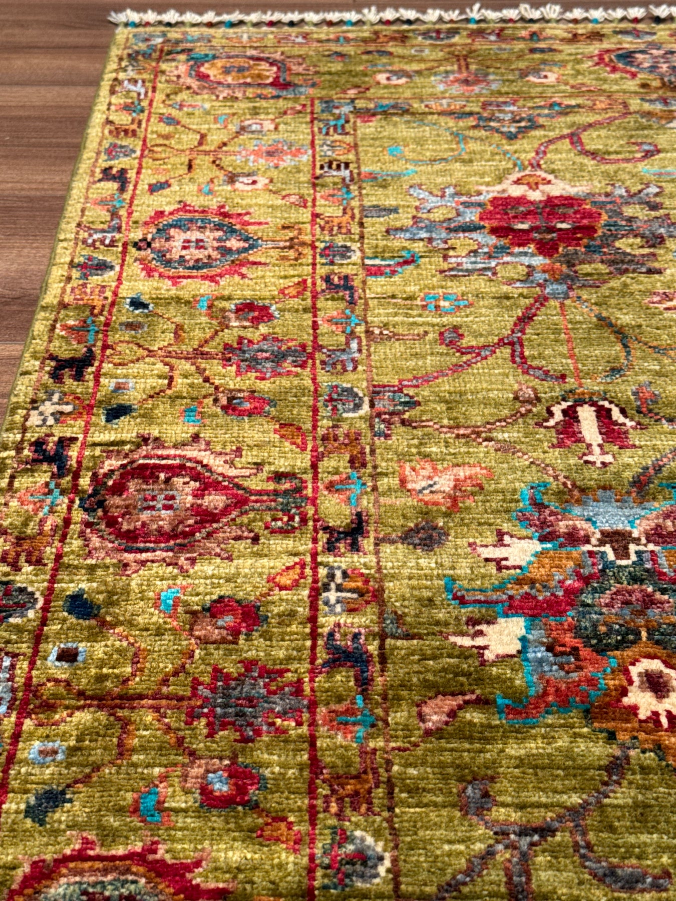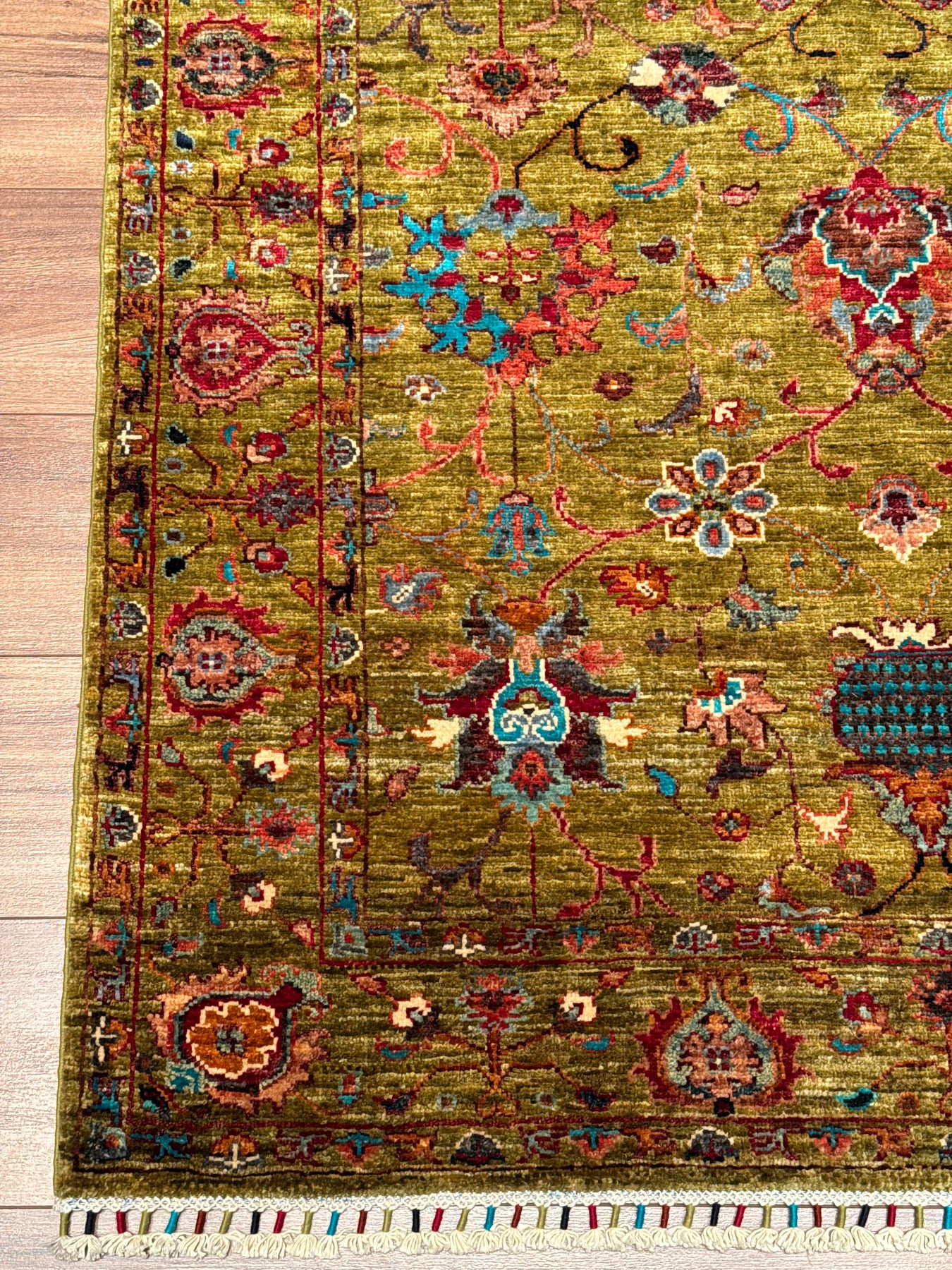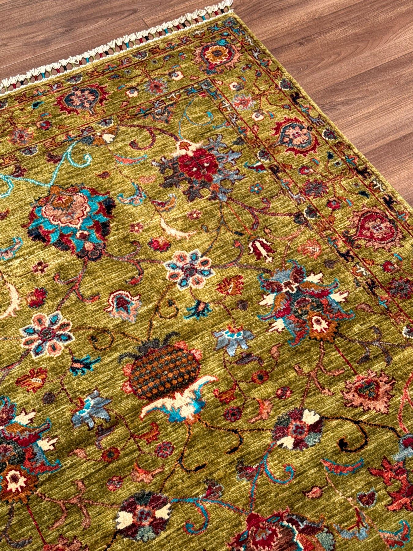 تتكون حشوة وسدّة هذه السجادة من عقد قطنية وخيوط صوفية. ويتم أيضًا إنتاج الخيوط بالكامل يدويًا باستخدام كيرمان. يتم صبغ الخيوط الصوفية المستخدمة في العقد باستخدام صبغة الجذور، أي المواد الطبيعية. على سبيل المثال، للحصول على اللون الأحمر، يتم غلي خيوط الصوف مع بتلات الورد ويأخذ الخيط لون بتلة الورد؛ تسمى الخيوط المصبوغة بهذه الطريقة خيوط مصبوغة بالفوة. السجاد المصنوع من الخيوط المصبوغة بأصباغ الجذور يصبح أكثر إشراقا مع الاستخدام. ومن ناحية أخرى، تعتبر هذه السجادة من السجاد عالي الجودة من حيث كثافة النسيج ويتم نسجها بالعقدة التركية أي بتقنية العقدة المزدوجة؛ بفضل هذه الميزة، فهي أكثر متانة وتتمتع بعمر افتراضي أطول مقارنة بالسجاد الفارسي. وأخيراً، تم ربط ما يقرب من 400 ألف عقدة يدوية في نسج هذه السجادة.