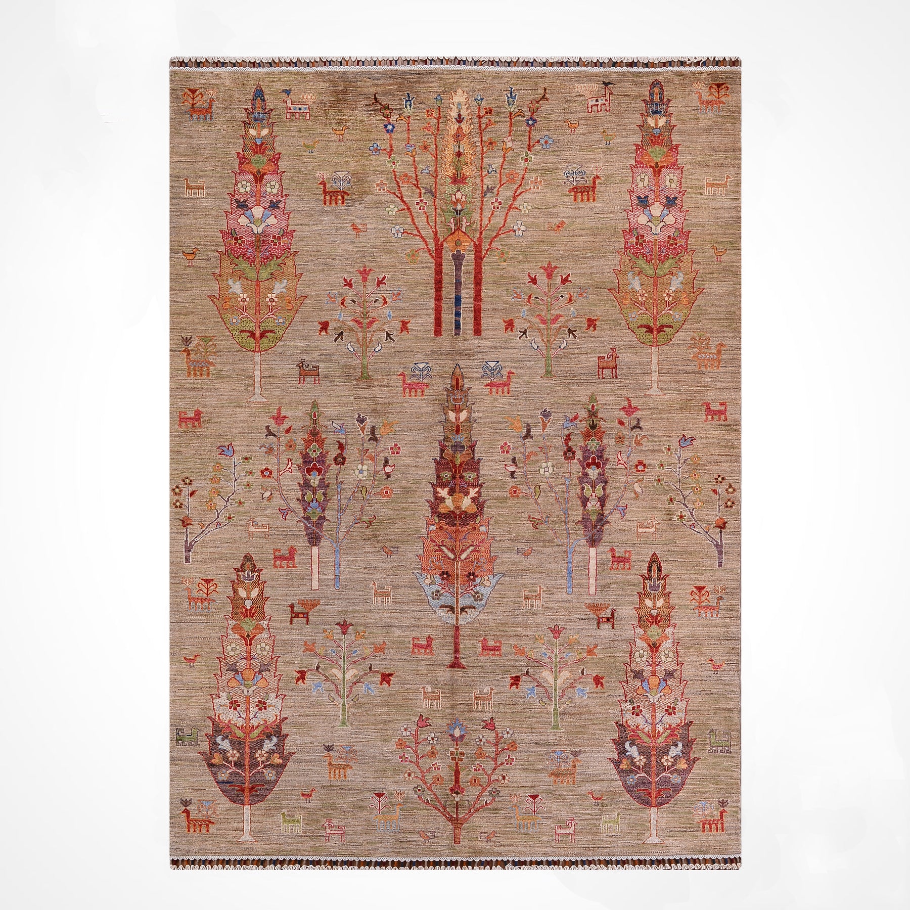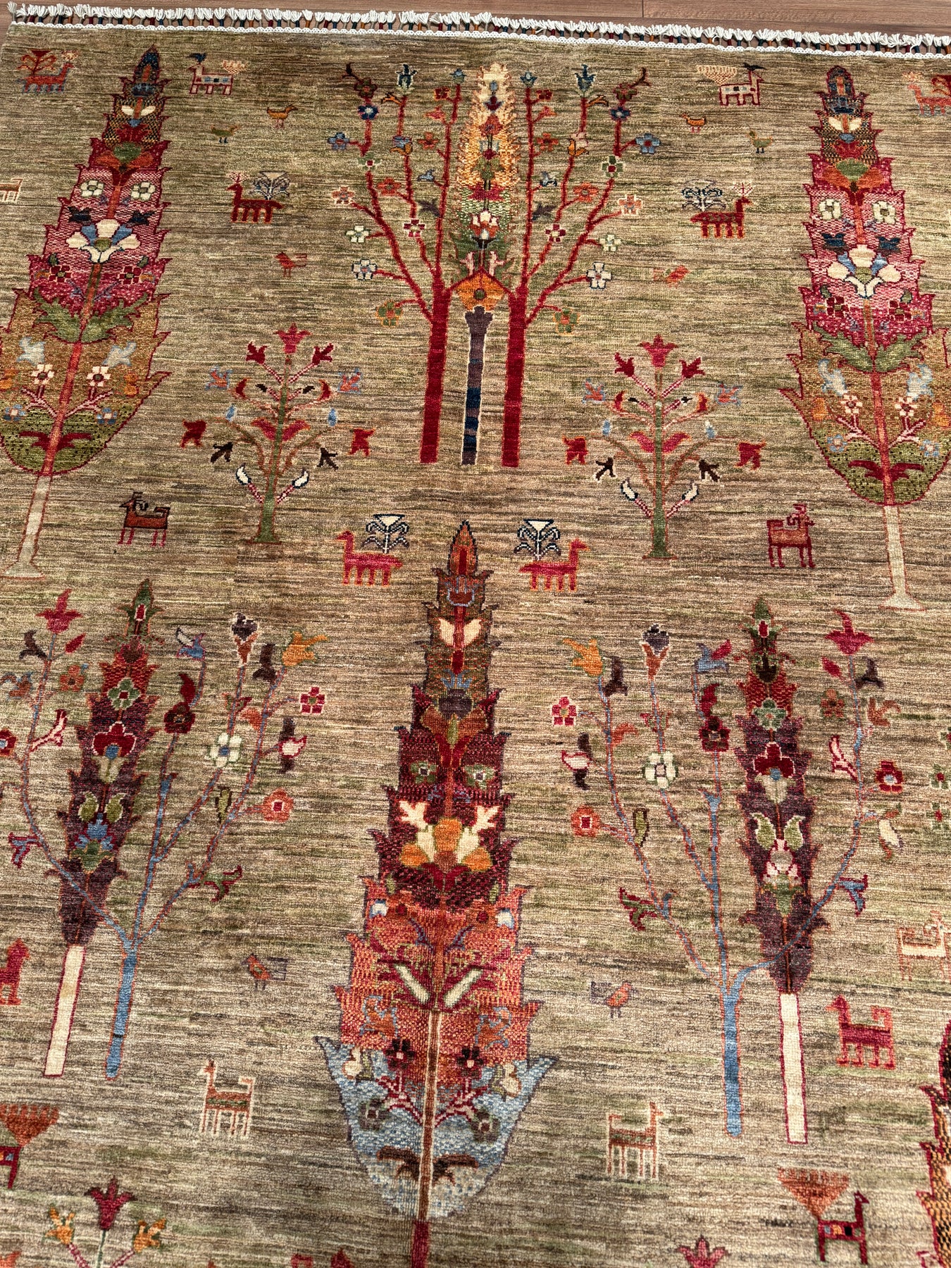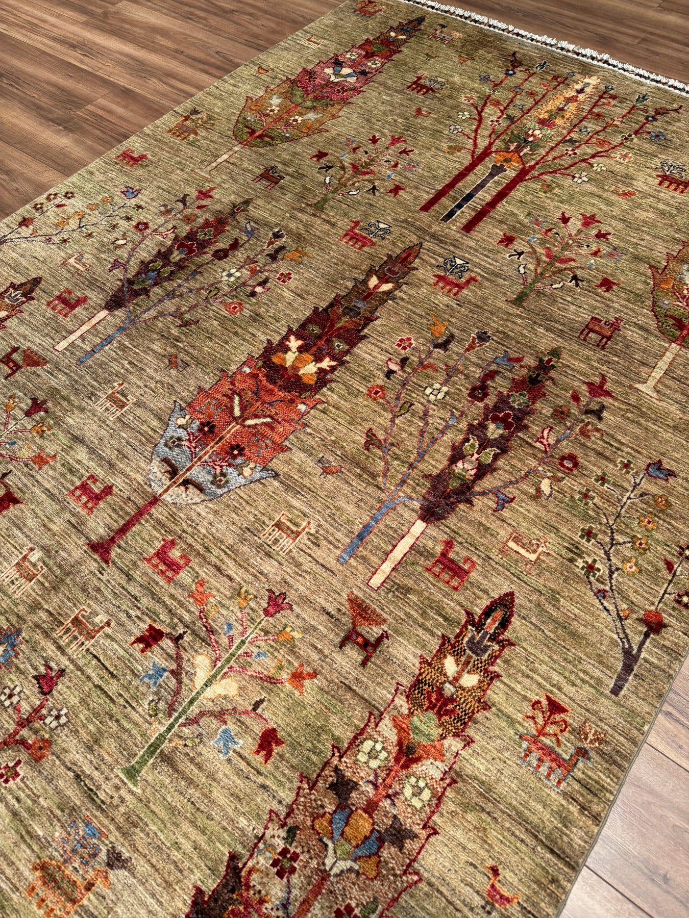 Khorjin Hayat Ağacı Orijinal El Dokuması Yeşil Bej Kök Boya Yün Halı 173x255 4.41 Metrekare - 5x8 ft
