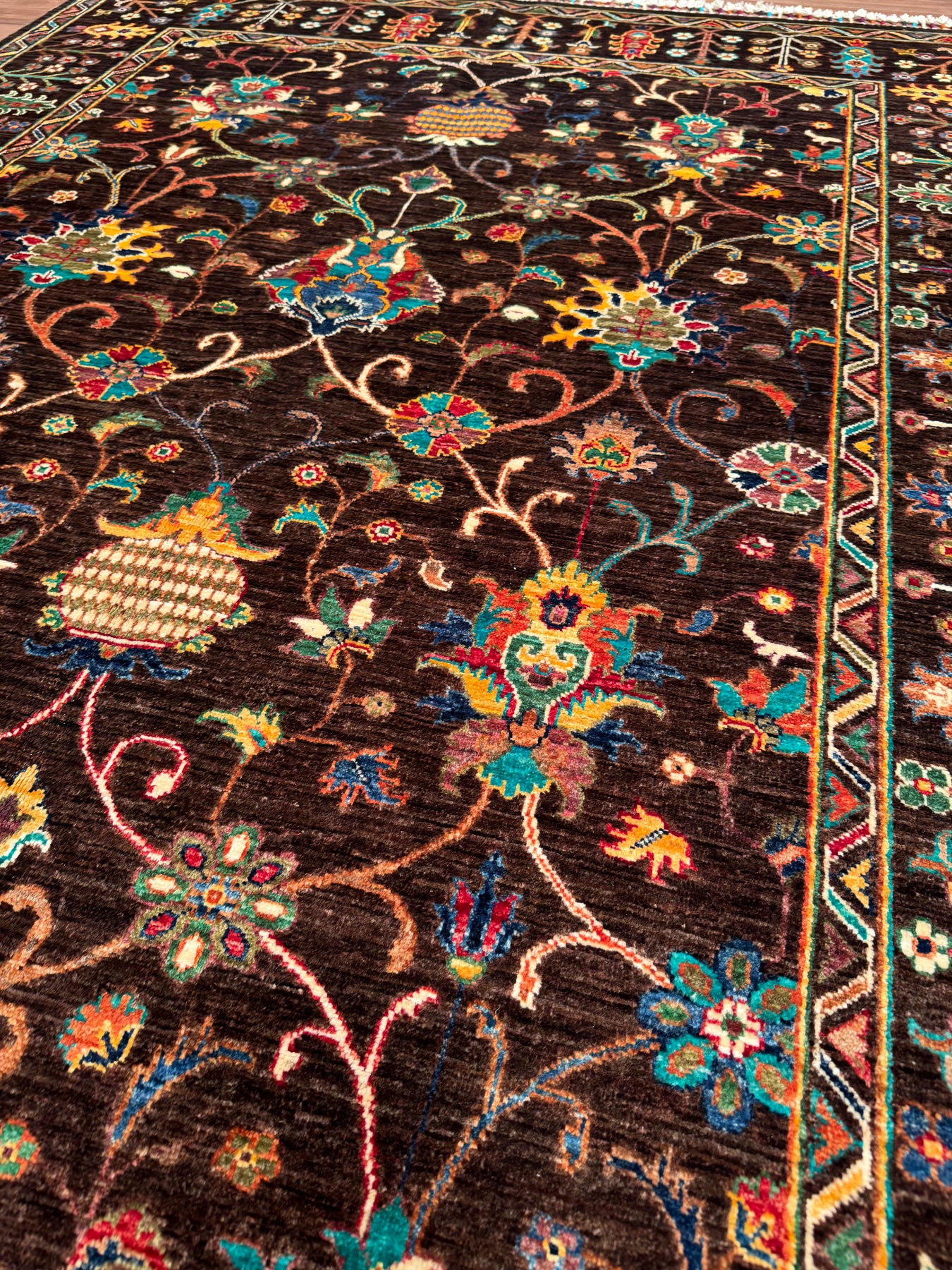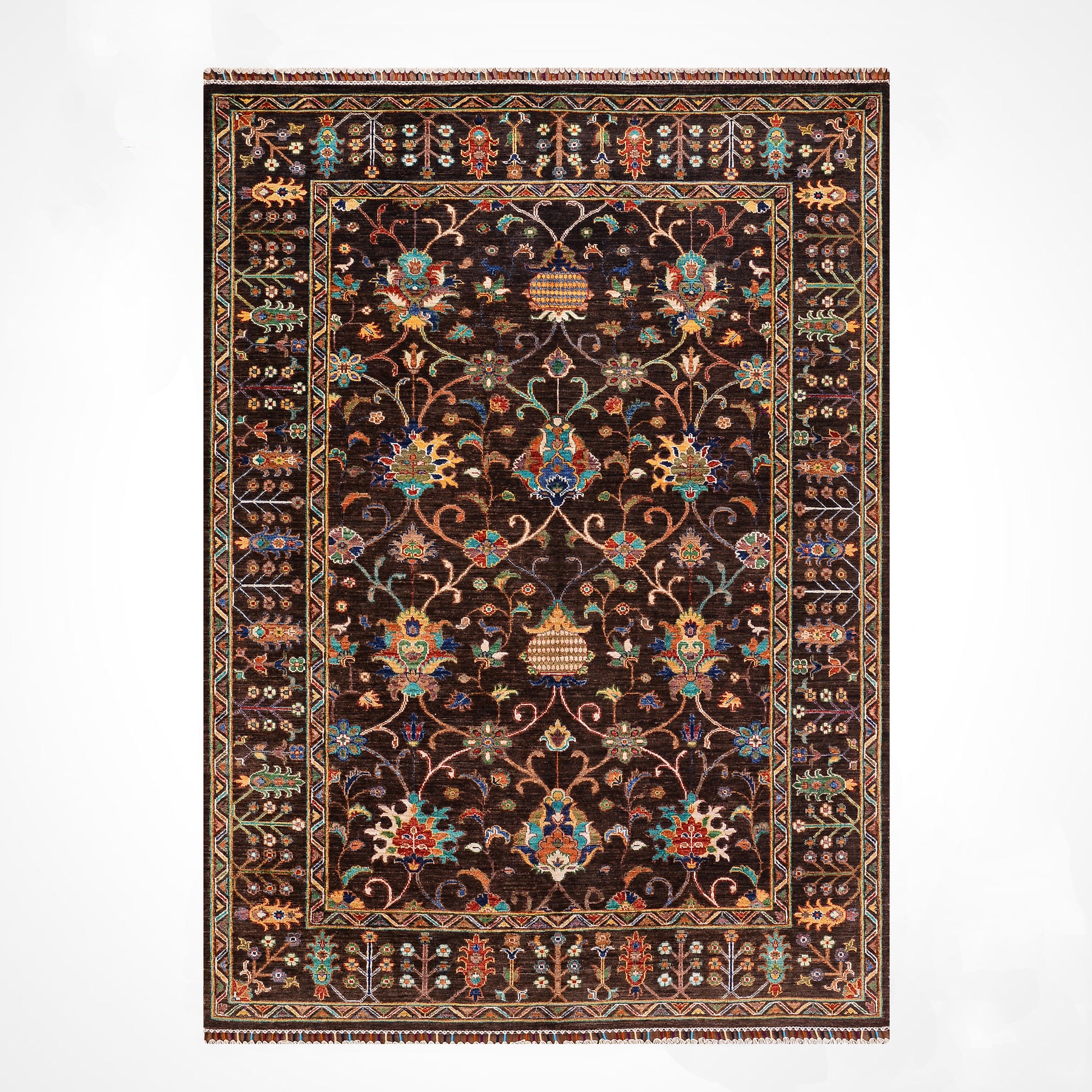 Bu halımızın atkı ve çözgüsü pamuk düğümleri yün ipliktir. İplikler de tamamen el ile kirman kullanılarak üretilmiştir. Düğümlerde kullanılan yün iplikler kök boya, yani doğal malzemeler, kullanılarak boyanmıştır. Örnek vermek gerekirse, kırmızı rengi elde etmek için yün iplikler gül yaprakları ile kaynatılır ve iplik gül yaprağının rengini alır; bu şekilde boyanmış ipliklere ise kök boya ile boyanmış iplikler denir. Kök boya ile boyanmış ipliklerden üretilen halılar, kullandıkça daha parlak bir görünüme sahip olur. Öte yandan, bu halımız dokuma sıklığı açısından üst kalite bir halı olup Türk düğümü bir diğer değişle çift düğüm tekniği ile dokunmuştur; bu özelliği sayesinde, daha dayanıklı olup İran halılarına kıyasla daha uzun ömre sahiptir.Son olarak, bu halımızın dokumasında yaklaşık 900.000 El düğümü atılmıştır.