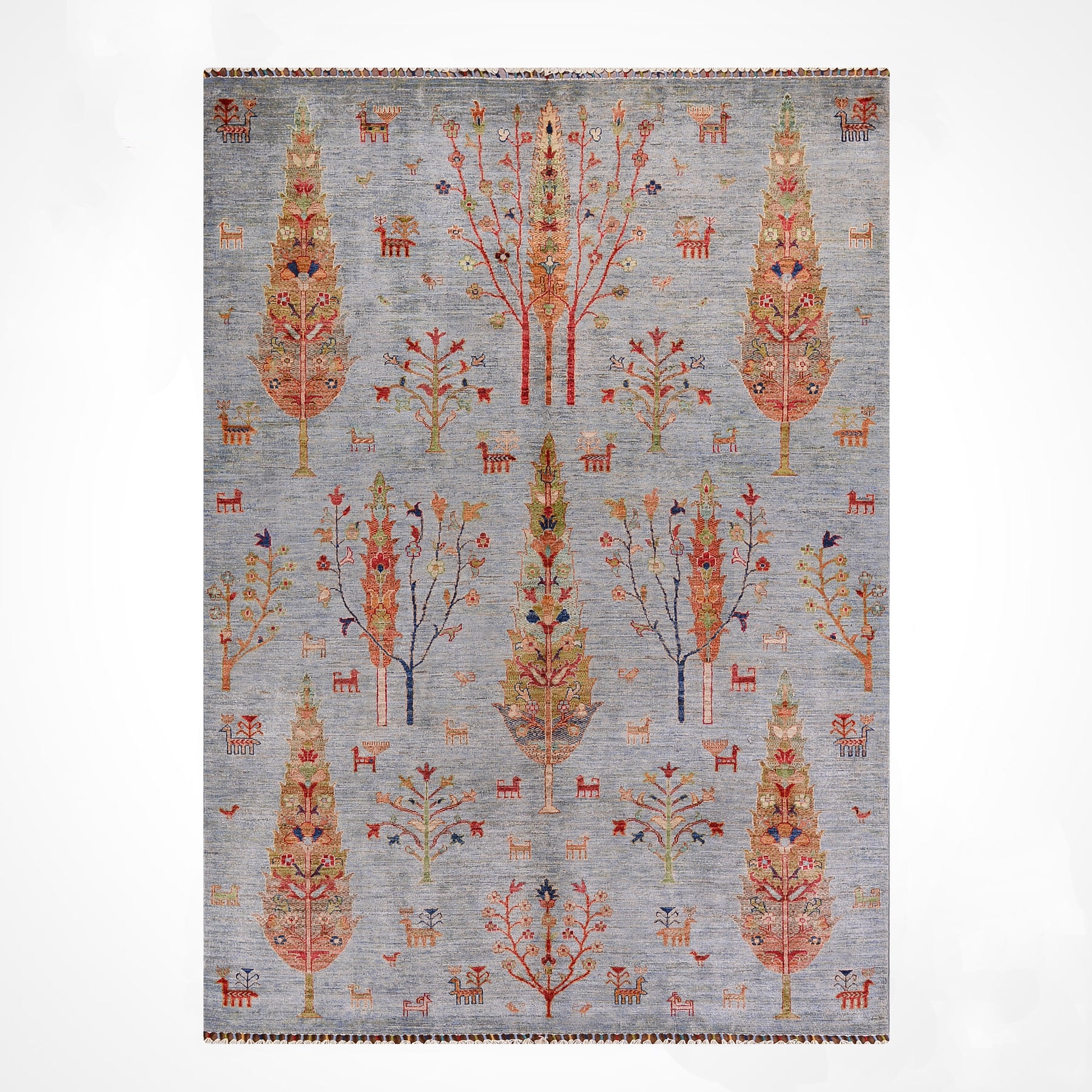 Bu halımızın atkı ve çözgüsü pamuk düğümleri yün ipliktir. İplikler de tamamen el ile kirman kullanılarak üretilmiştir. Düğümlerde kullanılan yün iplikler kök boya, yani doğal malzemeler, kullanılarak boyanmıştır. Örnek vermek gerekirse, kırmızı rengi elde etmek için yün iplikler gül yaprakları ile kaynatılır ve iplik gül yaprağının rengini alır; bu şekilde boyanmış ipliklere ise kök boya ile boyanmış iplikler denir. Kök boya ile boyanmış ipliklerden üretilen halılar, kullandıkça daha parlak bir görünüme sahip olur. Öte yandan, bu halımız dokuma sıklığı açısından üst kalite bir halı olup Türk düğümü bir diğer değişle çift düğüm tekniği ile dokunmuştur; bu özelliği sayesinde, daha dayanıklı olup İran halılarına kıyasla daha uzun ömre sahiptir. Son olarak, bu halımızın dokumasında yaklaşık 1.000.000 El düğümü atılmıştır.