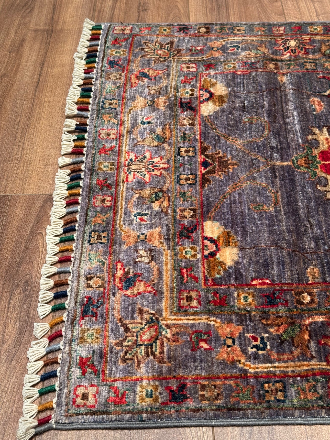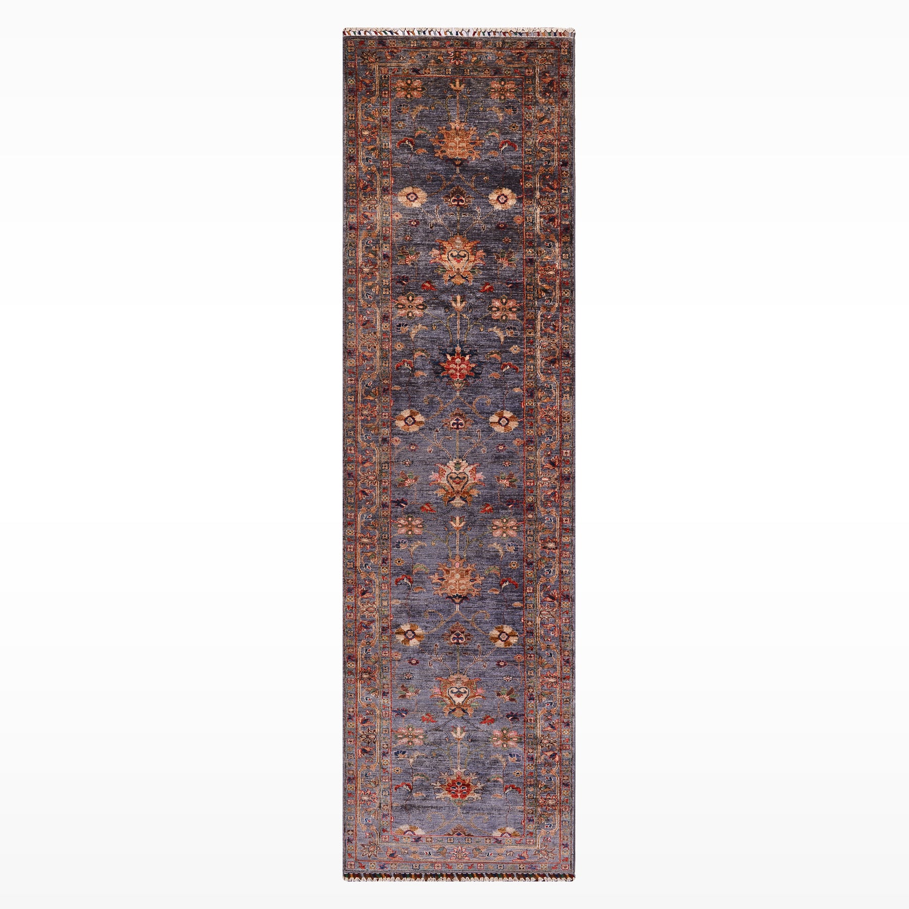 Sultani Çiçekli Yolluk Orijinal El Dokuması Gri Kök Boya Yün Halı 0.79x398 3.14 Metrekare - 3x12 ft