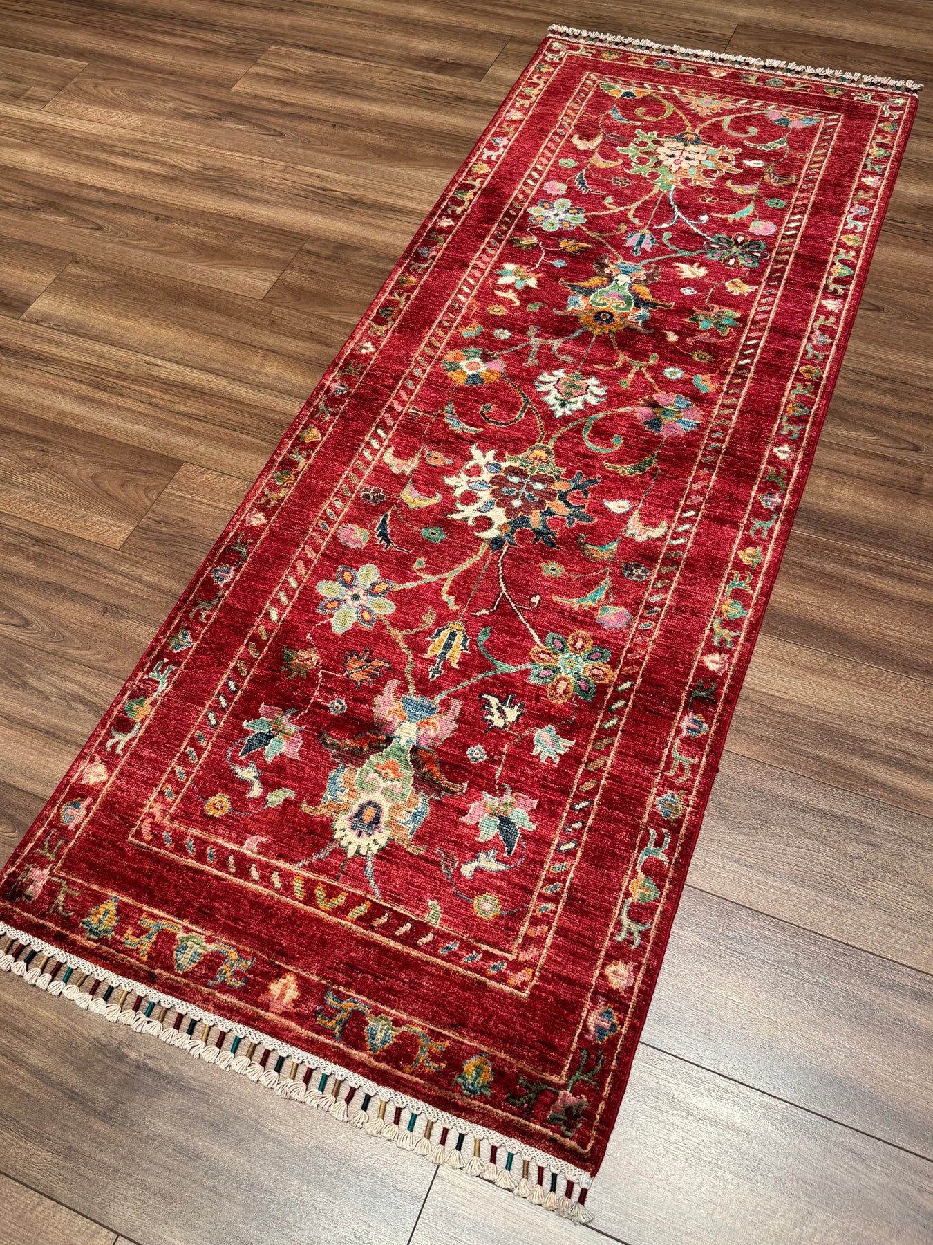 Bu halımızın atkı ve çözgüsü pamuk düğümleri yün ipliktir. İplikler de tamamen el ile kirman kullanılarak üretilmiştir. Düğümlerde kullanılan yün iplikler kök boya, yani doğal malzemeler, kullanılarak boyanmıştır. Örnek vermek gerekirse, kırmızı rengi elde etmek için yün iplikler gül yaprakları ile kaynatılır ve iplik gül yaprağının rengini alır; bu şekilde boyanmış ipliklere ise kök boya ile boyanmış iplikler denir. Kök boya ile boyanmış ipliklerden üretilen halılar, kullandıkça daha parlak bir görünüme sahip olur. Öte yandan, bu halımız dokuma sıklığı açısından üst kalite bir halı olup Türk düğümü bir diğer değişle çift düğüm tekniği ile dokunmuştur; bu özelliği sayesinde, daha dayanıklı olup İran halılarına kıyasla daha uzun ömre sahiptir. Son olarak, bu halımızın dokumasında yaklaşık 400.000 El düğümü atılmıştır.