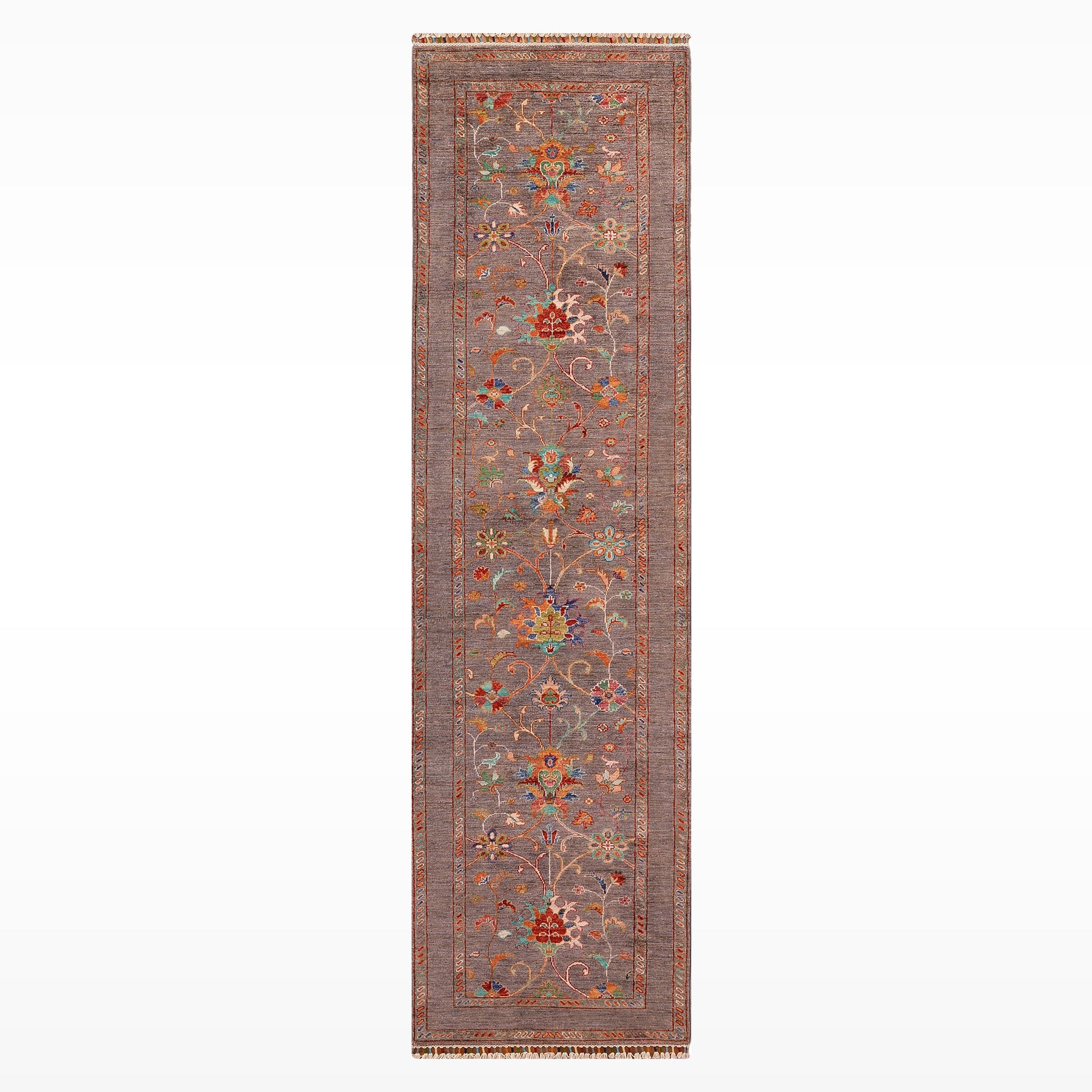 Sultani Çiçekli Yolluk Orijinal El Dokuması Gri Kök Boya Yün Halı 0.82x330 2.71 Metrekare - 2x10 ft