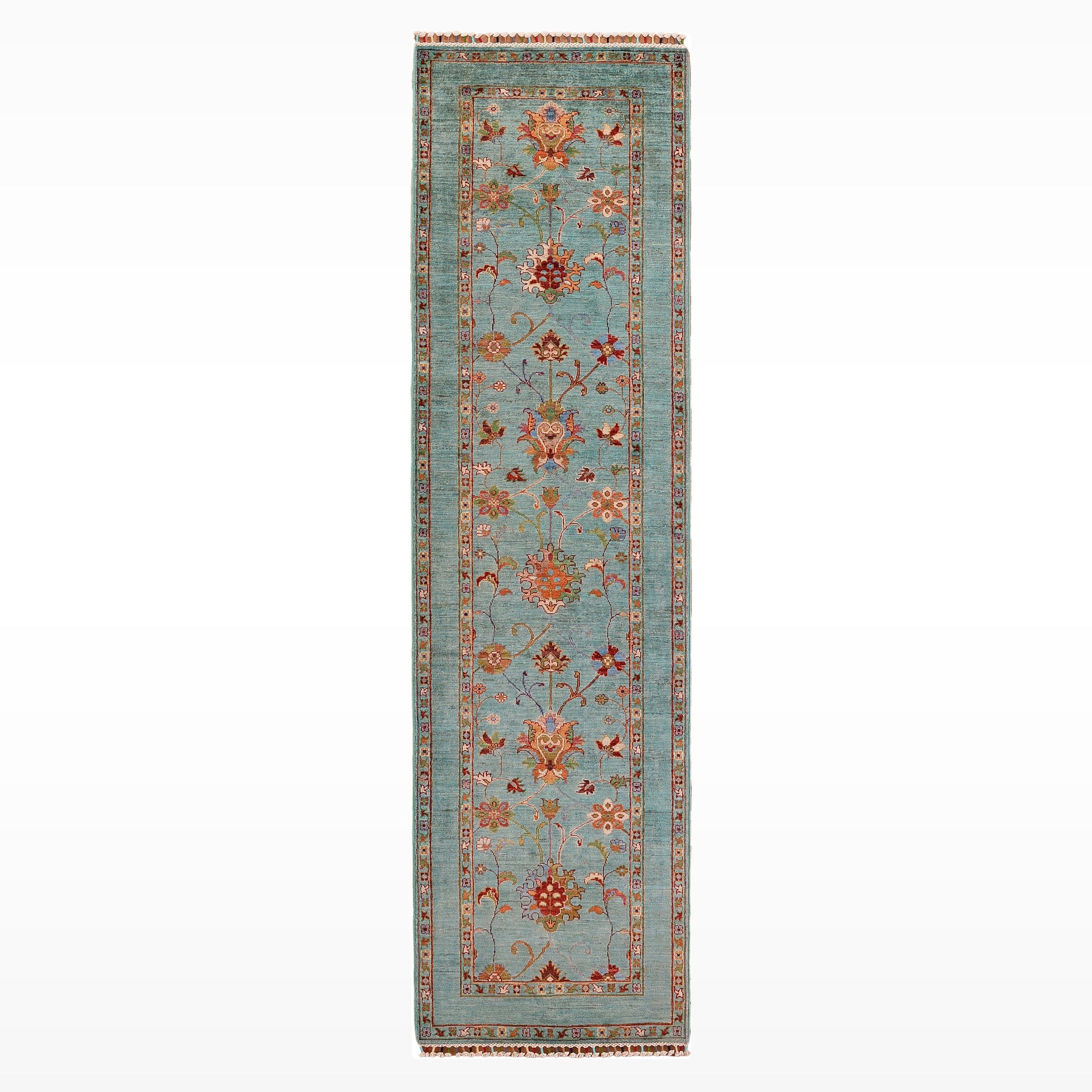 Sultani Çiçekli Yolluk Orijinal El Dokuması Turkuaz Kök Boya Yün Halı 0.83x315 2.61 Metrekare - 2x10 ft
