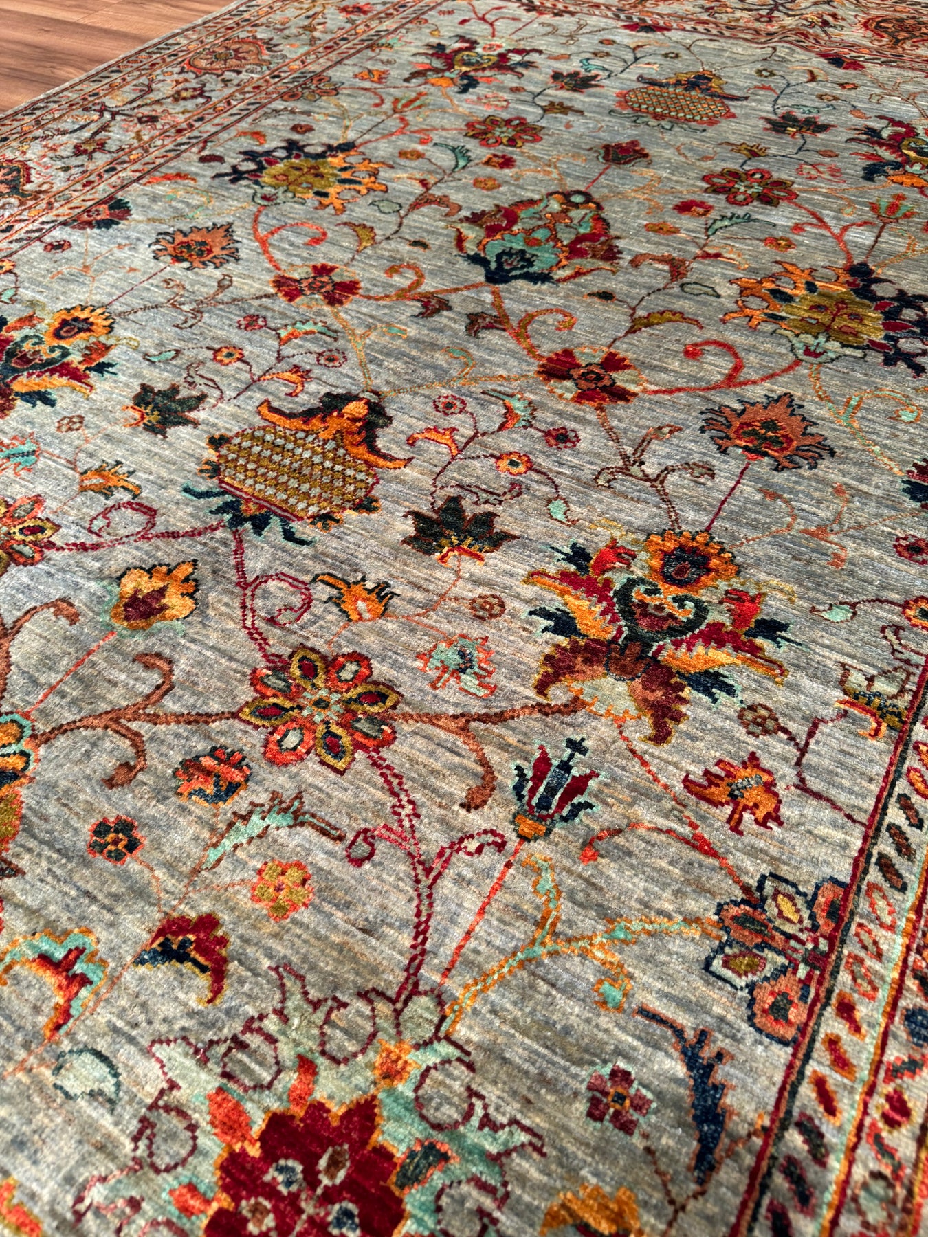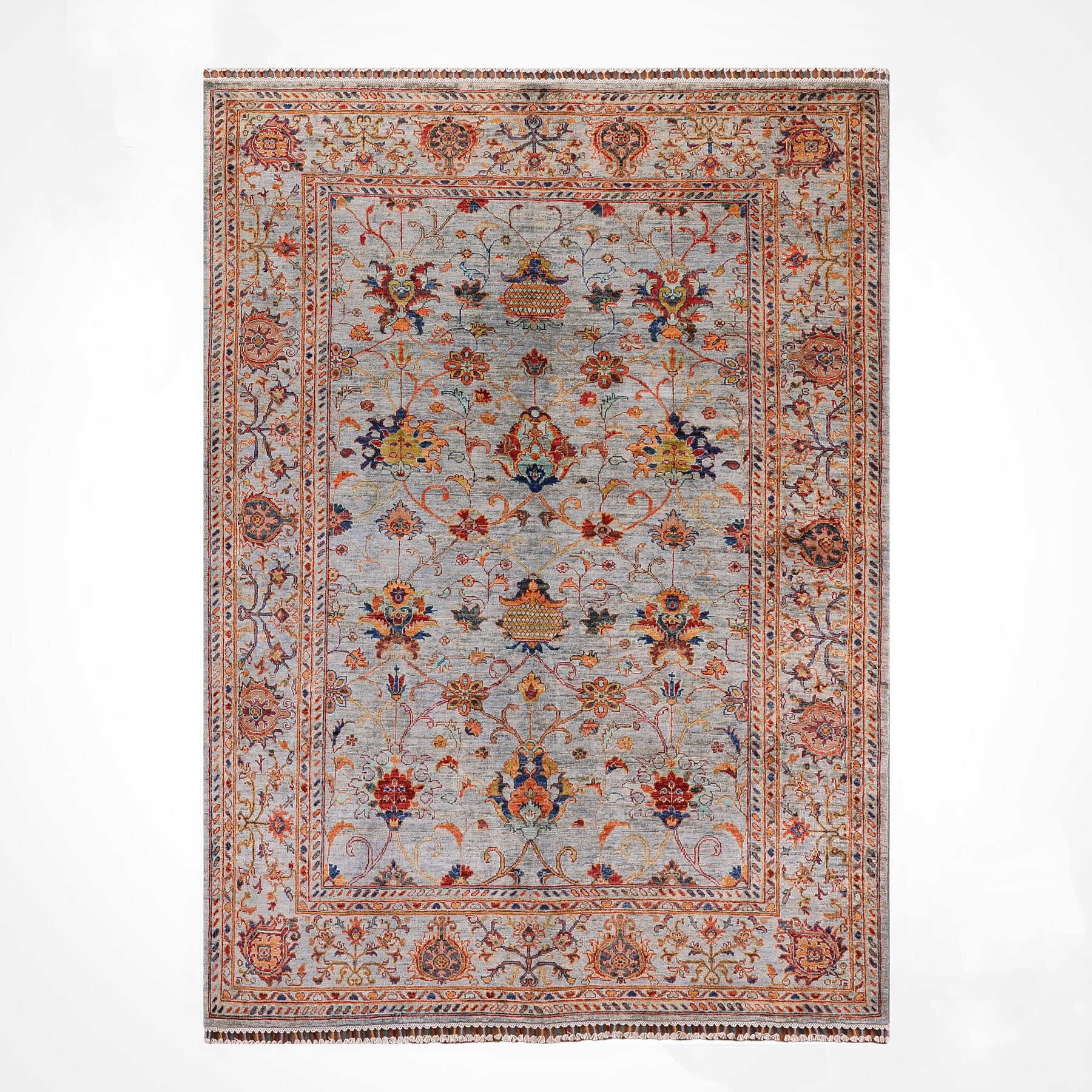 Bu halımızın atkı ve çözgüsü pamuk düğümleri yün ipliktir. İplikler de tamamen el ile kirman kullanılarak üretilmiştir. Düğümlerde kullanılan yün iplikler kök boya, yani doğal malzemeler, kullanılarak boyanmıştır. Örnek vermek gerekirse, kırmızı rengi elde etmek için yün iplikler gül yaprakları ile kaynatılır ve iplik gül yaprağının rengini alır; bu şekilde boyanmış ipliklere ise kök boya ile boyanmış iplikler denir. Kök boya ile boyanmış ipliklerden üretilen halılar, kullandıkça daha parlak bir görünüme sahip olur. Öte yandan, bu halımız dokuma sıklığı açısından üst kalite bir halı olup Türk düğümü bir diğer değişle çift düğüm tekniği ile dokunmuştur; bu özelliği sayesinde, daha dayanıklı olup İran halılarına kıyasla daha uzun ömre sahiptir. Son olarak, Bu halımızın dokumasında yaklaşık 600.000 El düğümü atılmıştır.