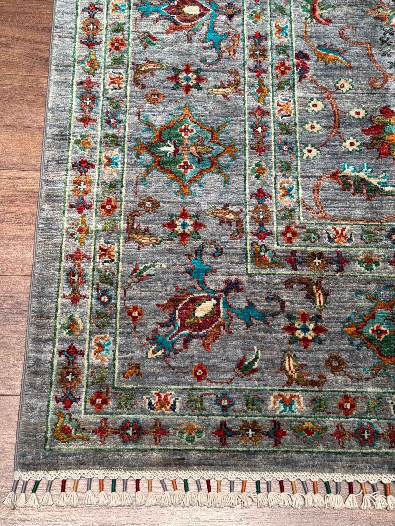 Bu halımızın atkı ve çözgüsü pamuk düğümleri yün ipliktir. İplikler de tamamen el ile kirman kullanılarak üretilmiştir. Düğümlerde kullanılan yün iplikler kök boya, yani doğal malzemeler, kullanılarak boyanmıştır. Örnek vermek gerekirse, kırmızı rengi elde etmek için yün iplikler gül yaprakları ile kaynatılır ve iplik gül yaprağının rengini alır; bu şekilde boyanmış ipliklere ise kök boya ile boyanmış iplikler denir. Kök boya ile boyanmış ipliklerden üretilen halılar, kullandıkça daha parlak bir görünüme sahip olur. Öte yandan, bu halımız dokuma sıklığı açısından üst kalite bir halı olup Türk düğümü bir diğer değişle çift düğüm tekniği ile dokunmuştur; bu özelliği sayesinde, daha dayanıklı olup İran halılarına kıyasla daha uzun ömre sahiptir. Son olarak, bu halımızın dokumasında yaklaşık 1.930.000 El düğümü atılmıştır.