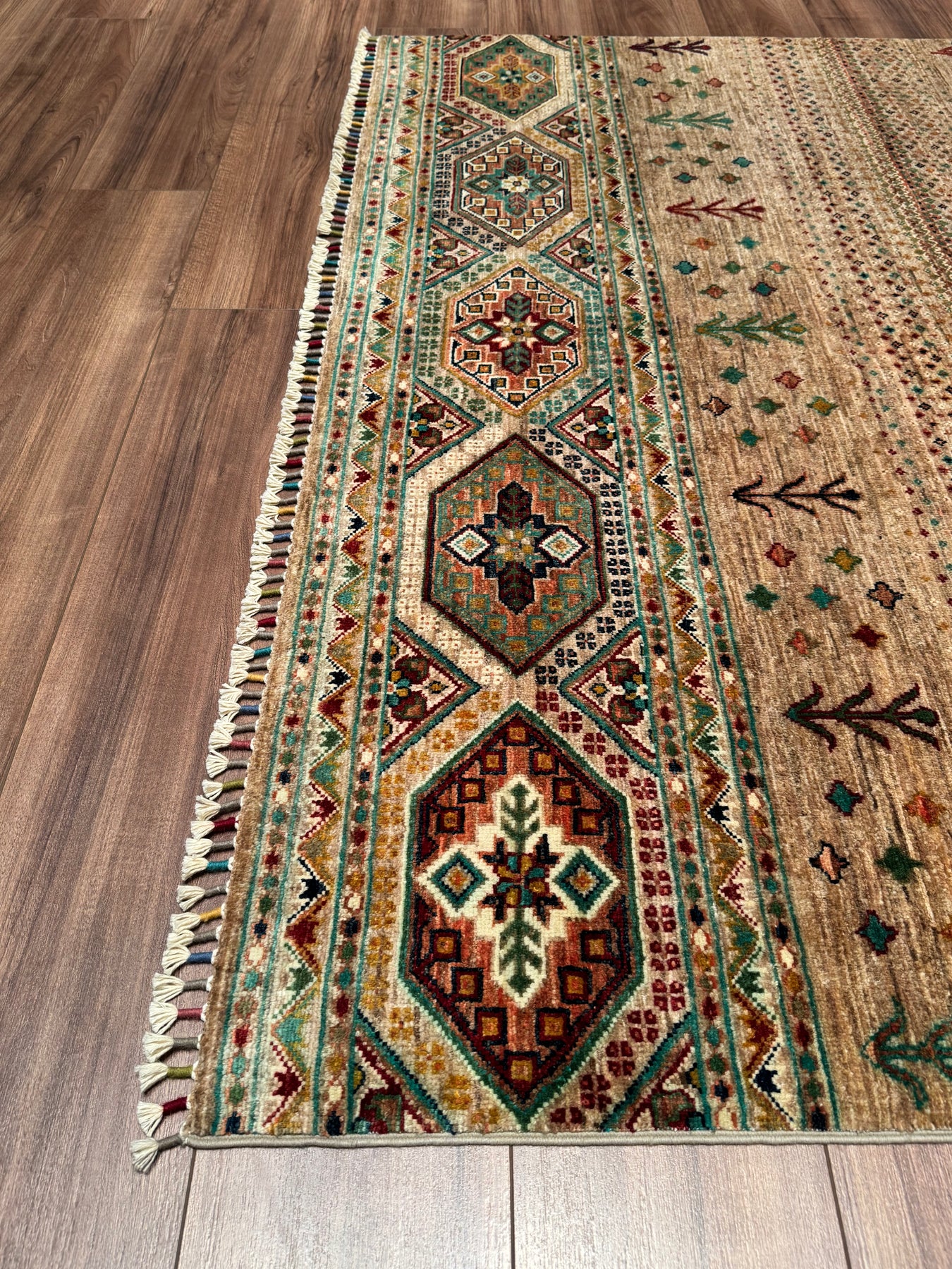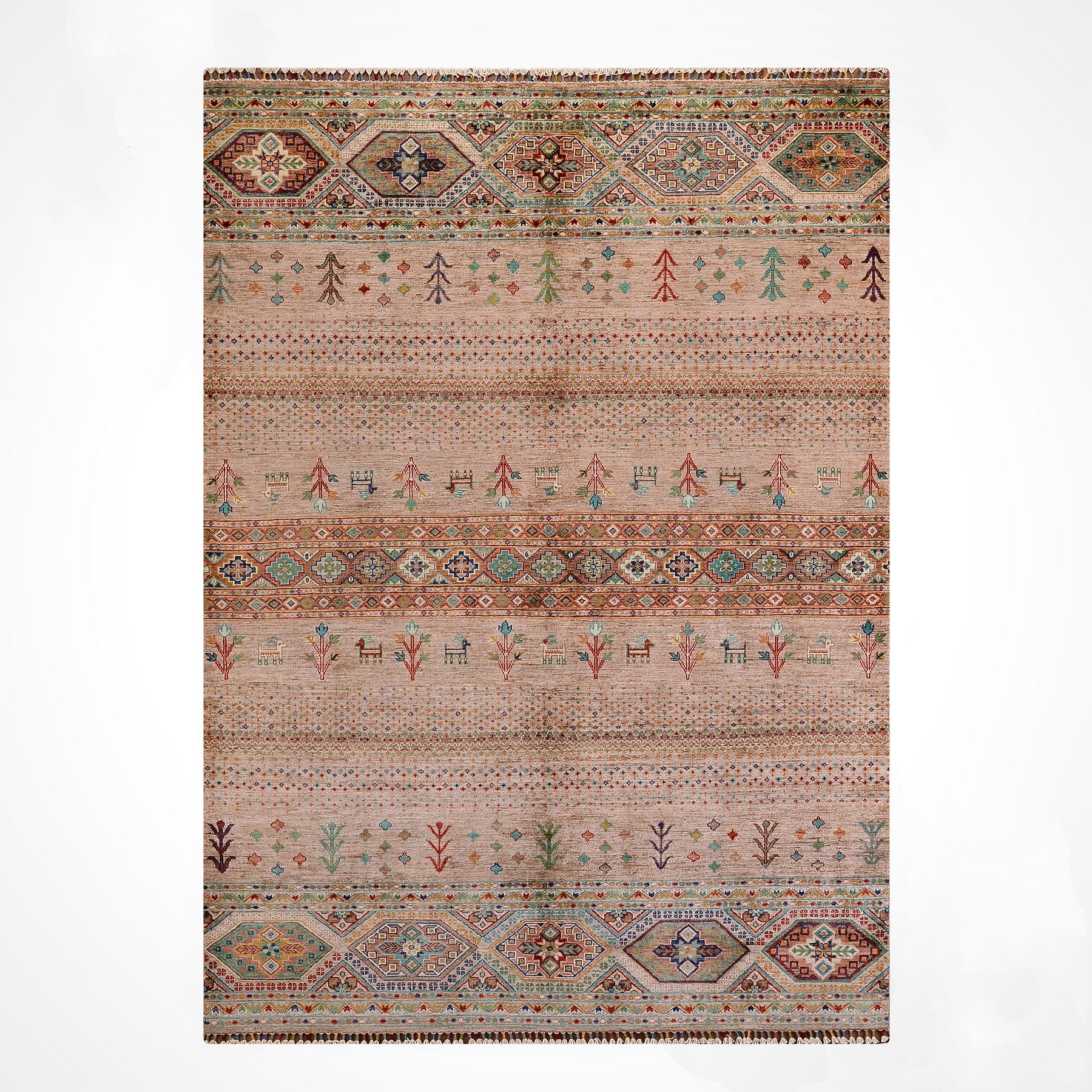This rug's warp and weft are cotton, and the knots are wool yarn. The yarn is entirely hand-made using a spinning wheel. The wool yarn used in the knots is dyed with Vegetable Dyeds, meaning natural materials. For example, to obtain red, the wool yarn is boiled with rose petals, and the yarn takes on the color of the rose petal; yarns dyed in this way are called root-dyed yarns. Rugs made from root-dyed yarns develop a brighter appearance with use. On the other hand, this rug is a high-quality rug in terms of weaving density and is woven using the Turkish knot, or double knot technique; thanks to this feature, it is more durable and has a longer lifespan compared to Persian rugs. Finally, approximately 600,000 hand knots were made in the weaving of this rug.