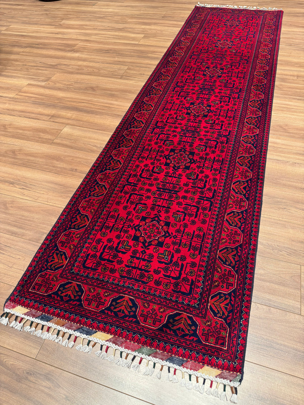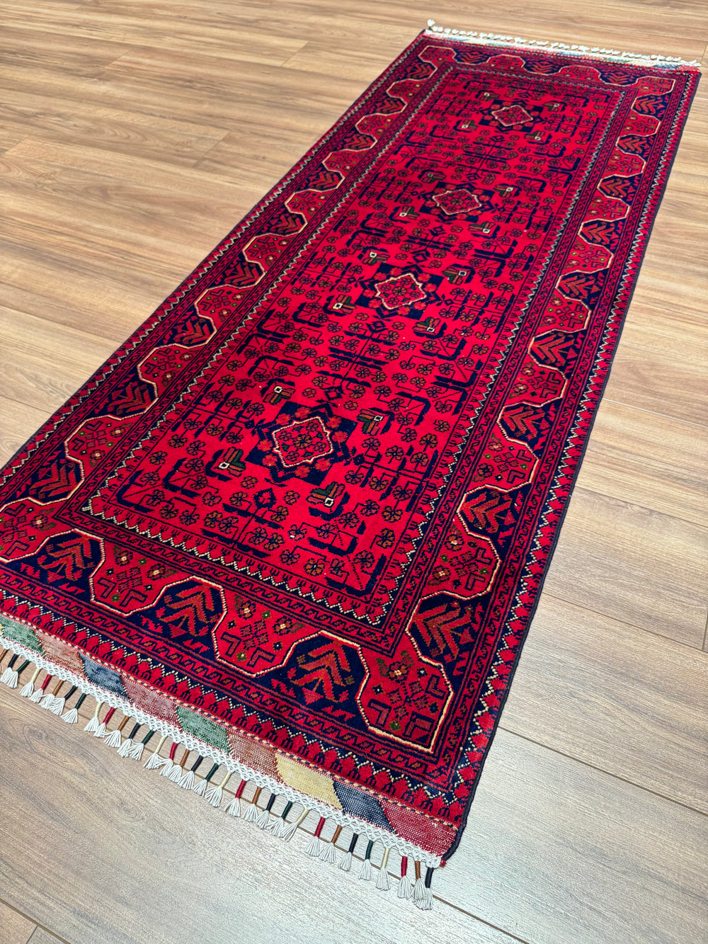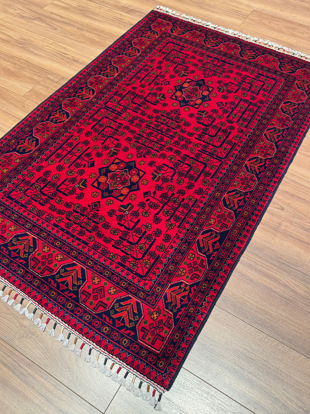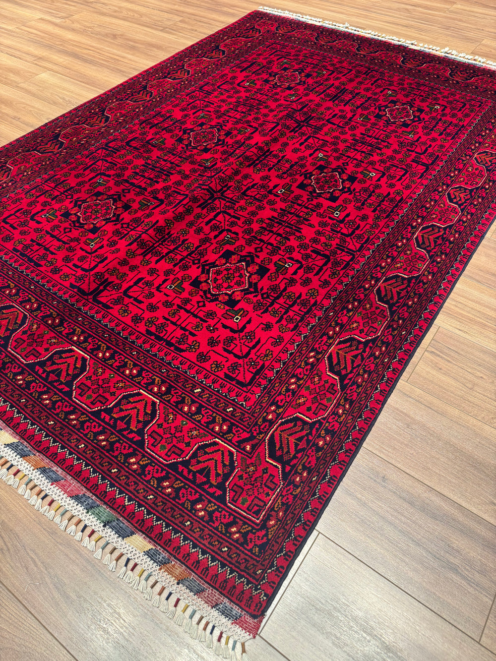 The original Afghan carpet is produced with the hand-woven carpet technique, made of natural wool or silk materials, and the texture of these carpets is soft and warm. The patterns consist of original geometric and symbolic motifs belonging to traditional Afghan culture, and the colors are obtained with natural dyes and do not fade over time. The edge embroidery is meticulously done by hand, and the marks on the back of the carpet are irregular as a natural result of the hand-weaving process. In addition, the color transitions of the original Afghan carpet are natural, deep and vibrant, without artificial brightness or hard textures.