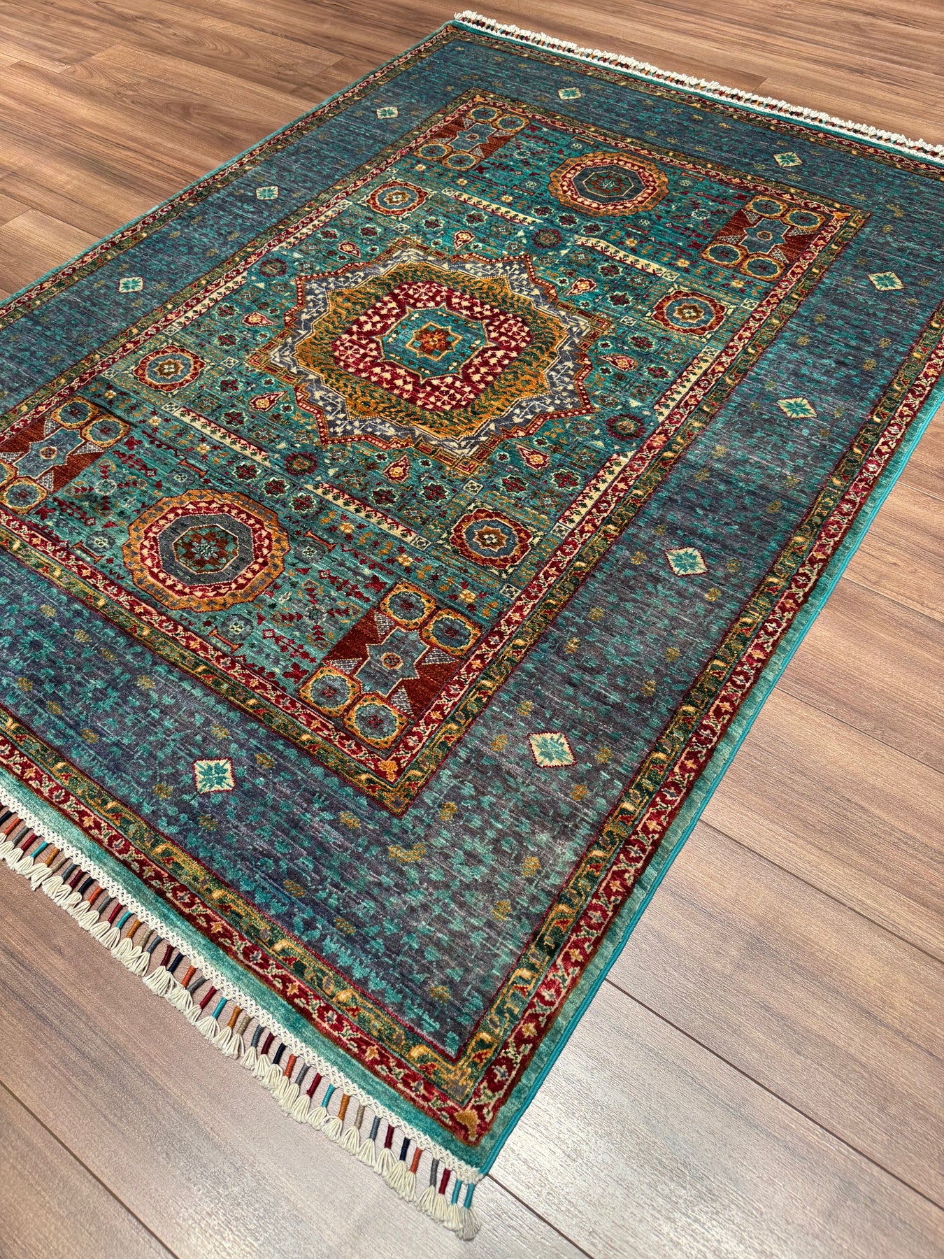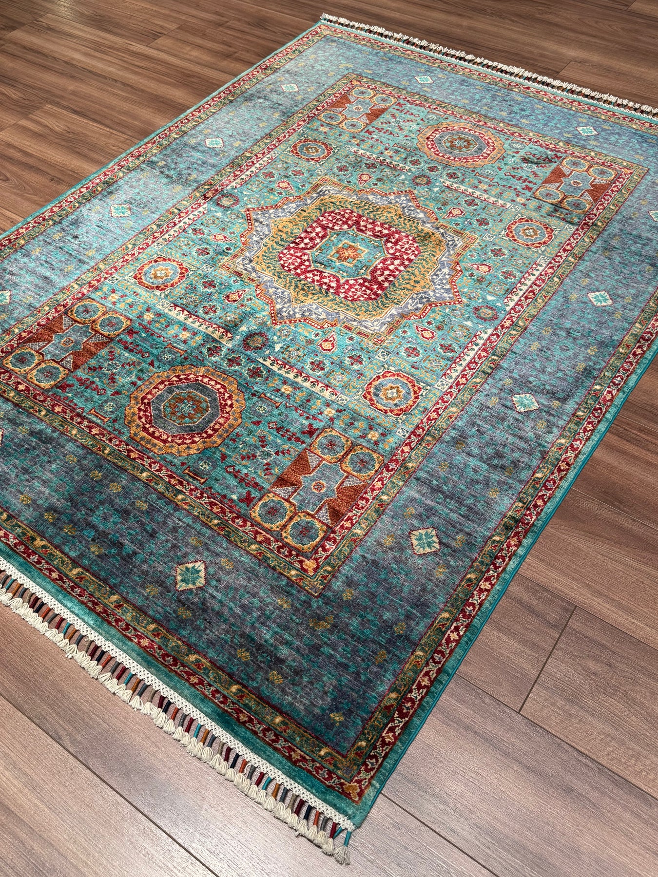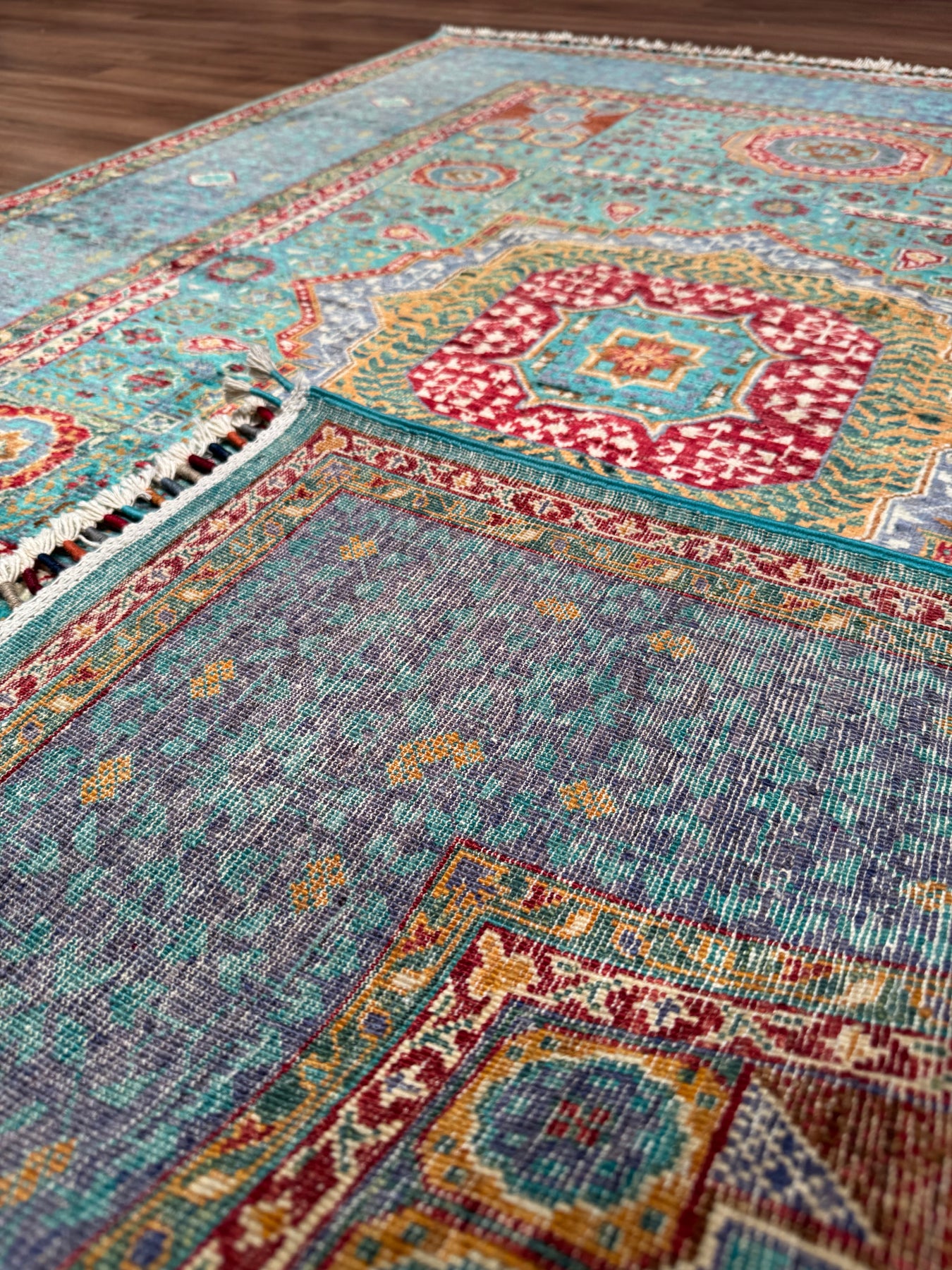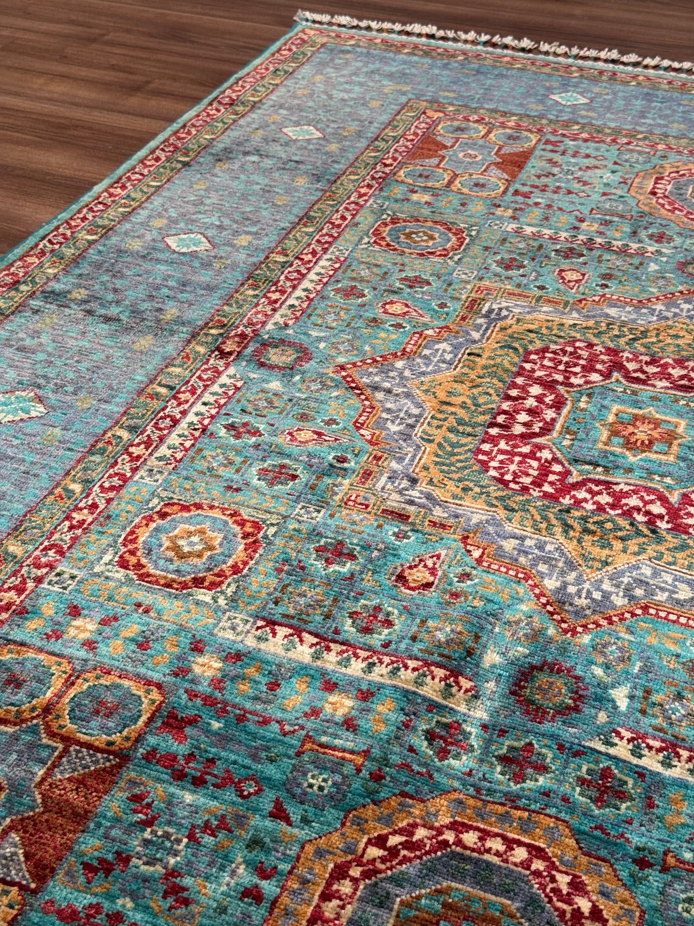 This rug's warp and weft are cotton, and the knots are wool yarn. The yarn is entirely hand-made using a spinning wheel. The wool yarn used in the knots is dyed with root dyes, meaning natural materials. For example, to obtain red, the wool yarn is boiled with rose petals, and the yarn takes on the color of the rose petal; yarns dyed in this way are called root-dyed yarns. Rugs made from root-dyed yarns develop a brighter appearance with use. On the other hand, this rug is a high-quality rug in terms of weaving density and is woven using the Turkish knot, or double knot technique; thanks to this feature, it is more durable and has a longer lifespan compared to Persian rugs. Finally, approximately 1,000,000 hand knots were made in the weaving of this rug.