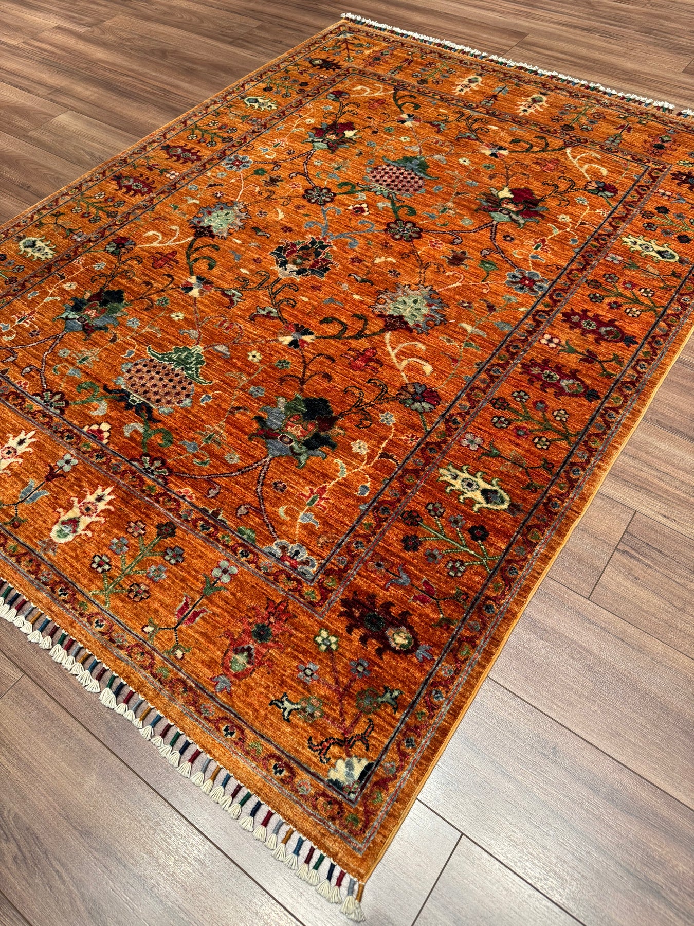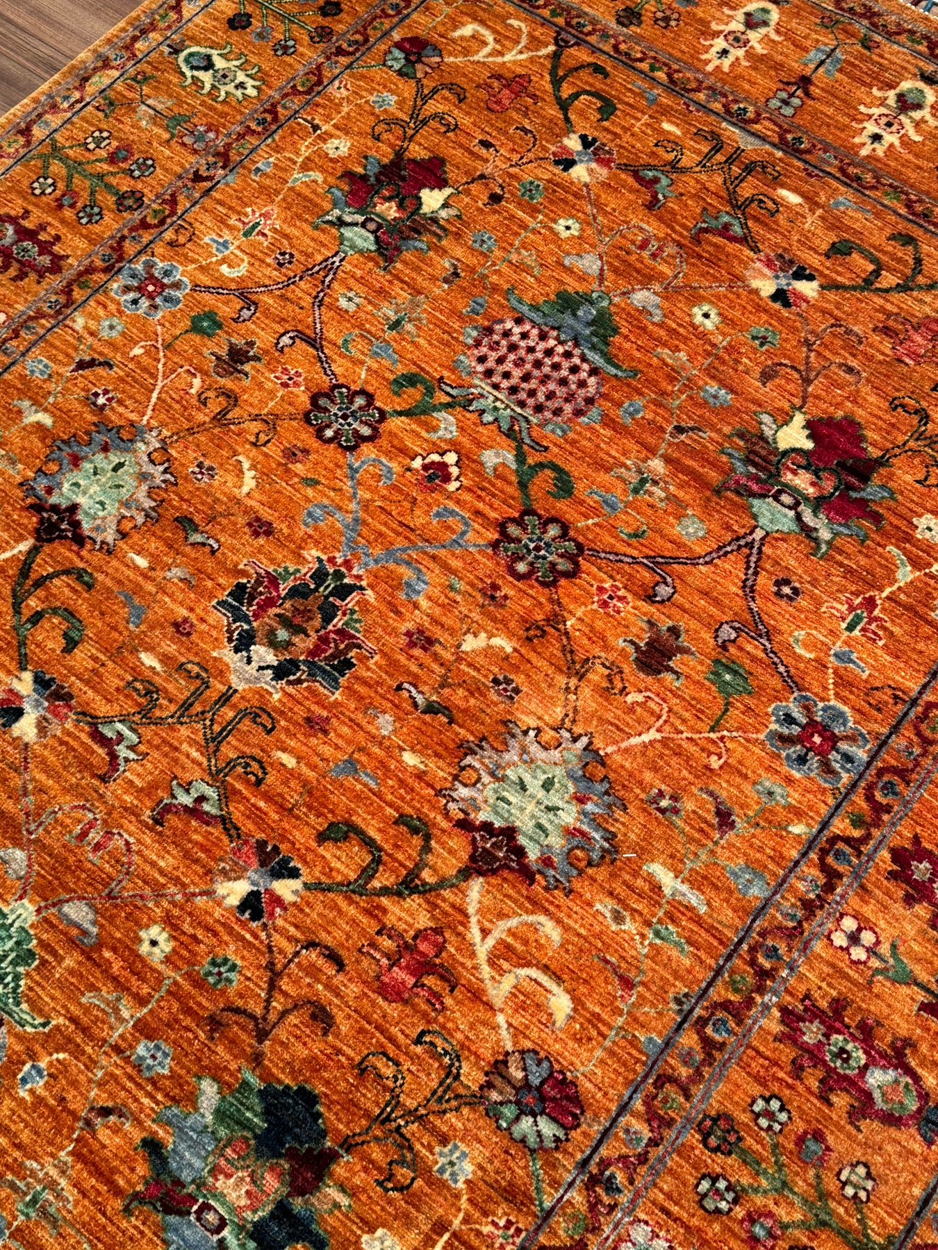 This rug's warp and weft are cotton, and the knots are wool yarn. The yarn is entirely hand-made using a spinning wheel. The wool yarn used in the knots is dyed with root dyes, meaning natural materials. For example, to obtain red, the wool yarn is boiled with rose petals, and the yarn takes on the color of the rose petal; yarns dyed in this way are called root-dyed yarns. Rugs made from root-dyed yarns develop a brighter appearance with use. On the other hand, this rug is a high-quality rug in terms of weaving density and is woven using the Turkish knot, or double knot technique; thanks to this feature, it is more durable and has a longer lifespan compared to Persian rugs. Finally, approximately 850,000 hand knots were made in the weaving of this rug.