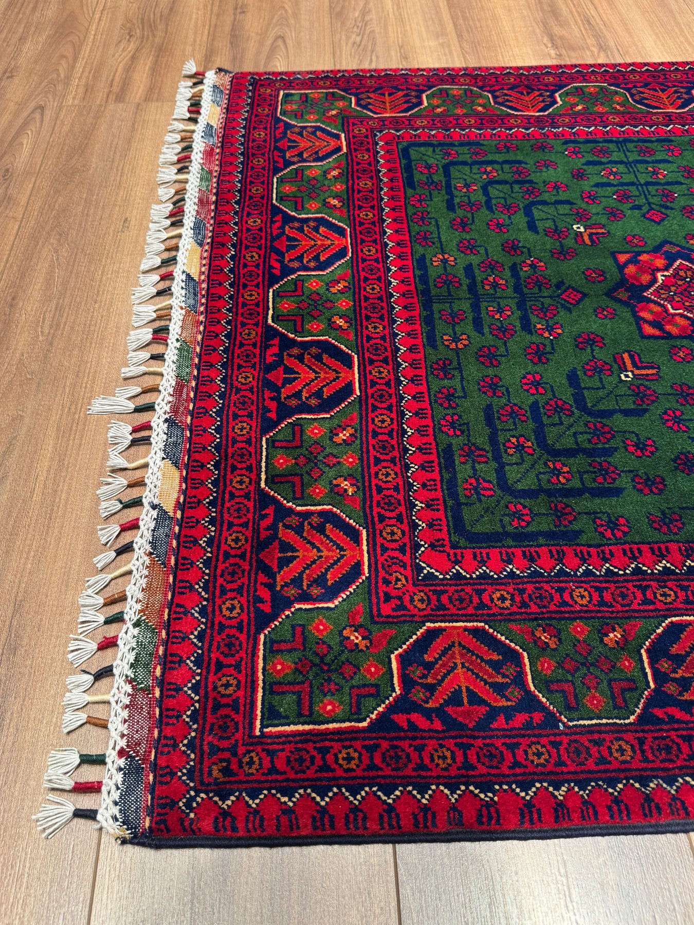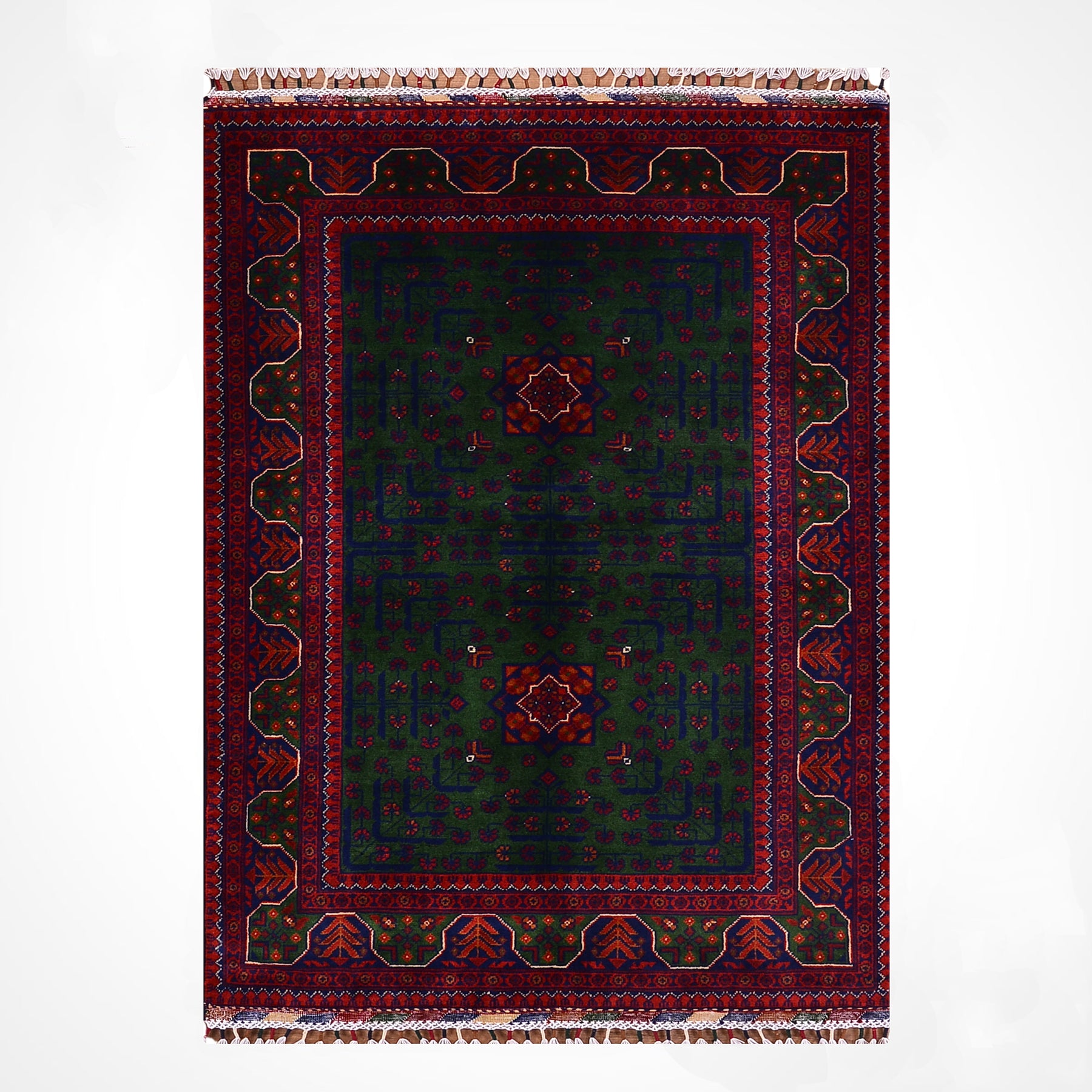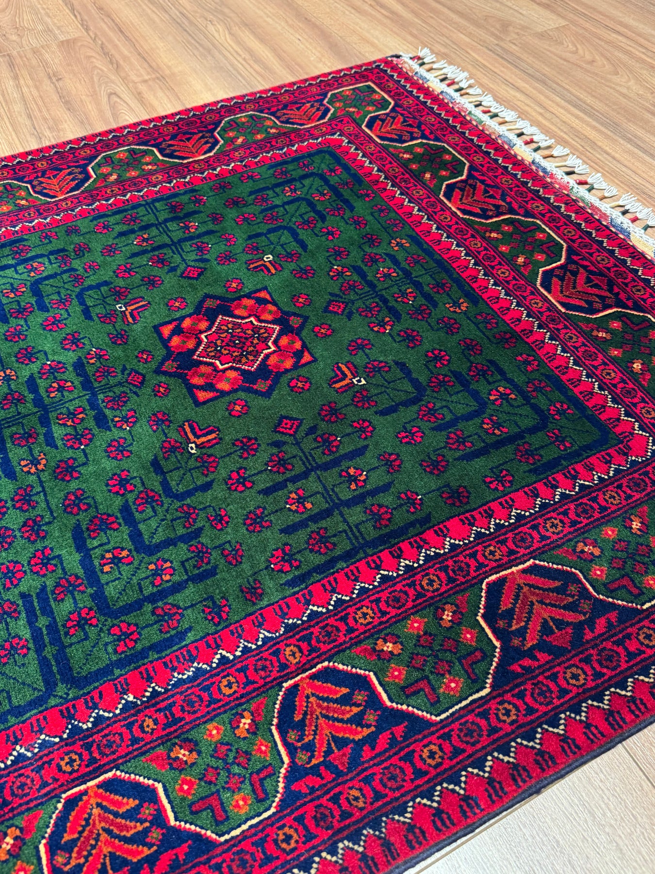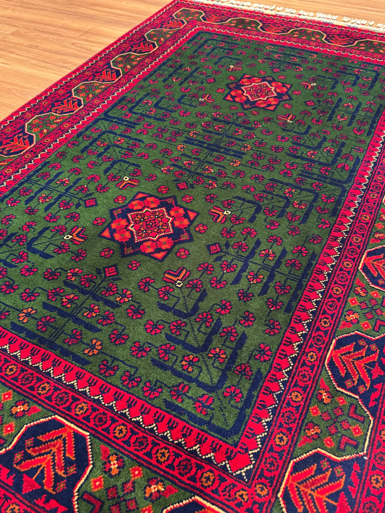 Afghan Rug, Green Hamyap, Original Handwoven, Root Dyed Wool, 101x152 cm (1.54 square meters) - 3x5 ft
