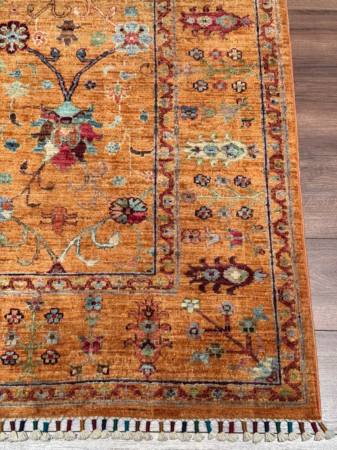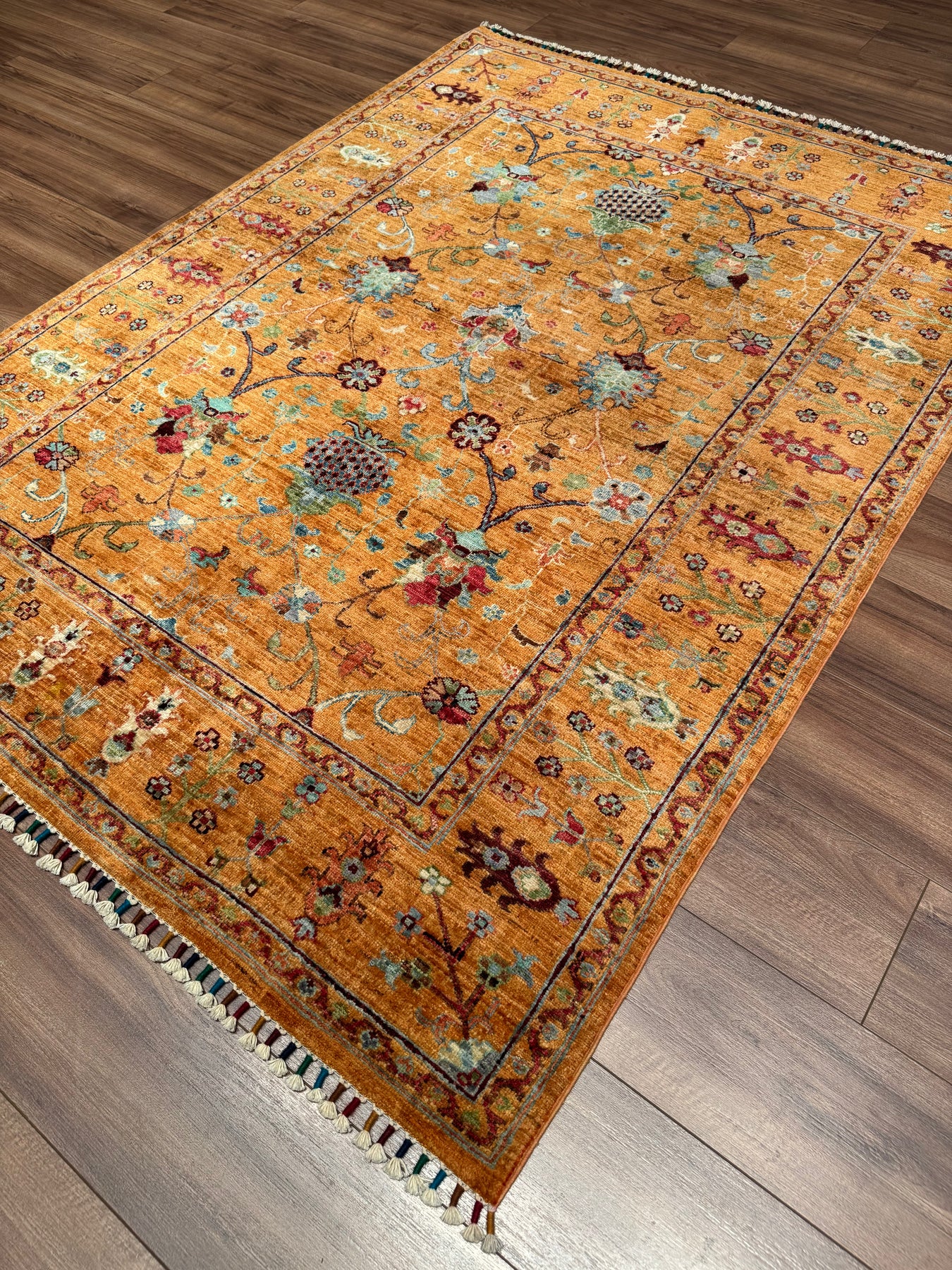 This rug's warp and weft are cotton, and the knots are wool yarn. The yarn is entirely hand-made using a spinning wheel. The wool yarn used in the knots is dyed with root dyes, meaning natural materials. For example, to obtain red, the wool yarn is boiled with rose petals, and the yarn takes on the color of the rose petal; yarns dyed in this way are called root-dyed yarns. Rugs made from root-dyed yarns develop a brighter appearance with use. On the other hand, this rug is a high-quality rug in terms of weaving density and is woven using the Turkish knot, or double knot technique; thanks to this feature, it is more durable and has a longer lifespan compared to Persian rugs. Finally, approximately 850,000 hand knots were made in the weaving of this rug.