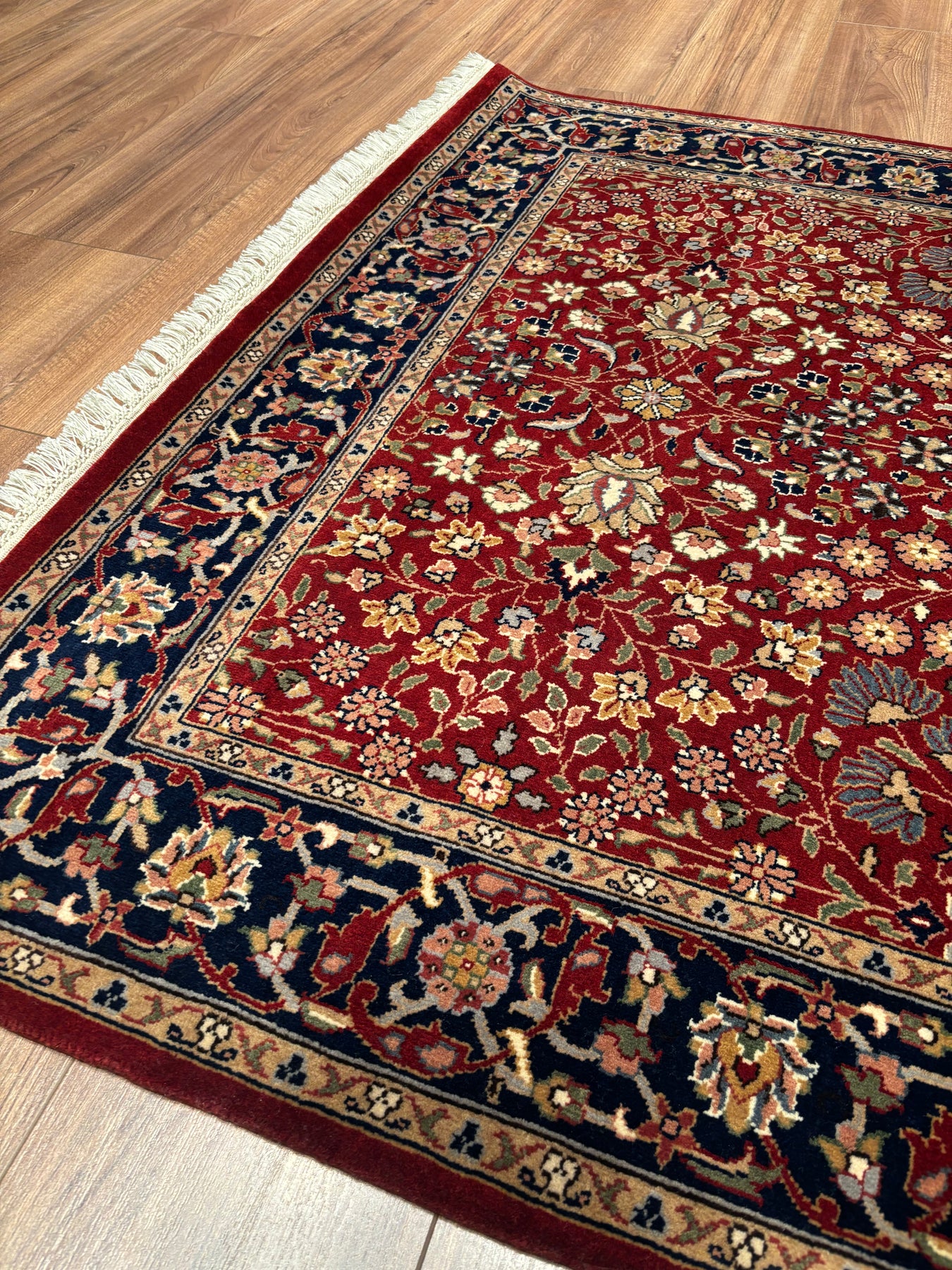 This rug's warp and weft are cotton, and the knots are wool yarn. The yarns are entirely hand-made using a spinning wheel. Furthermore, this rug is of superior quality in terms of weaving density and is woven using the Turkish knot, or double knot technique; this feature makes it more durable and gives it a longer lifespan compared to Persian rugs. Finally, approximately 800,000 hand knots were used in the weaving of this rug.