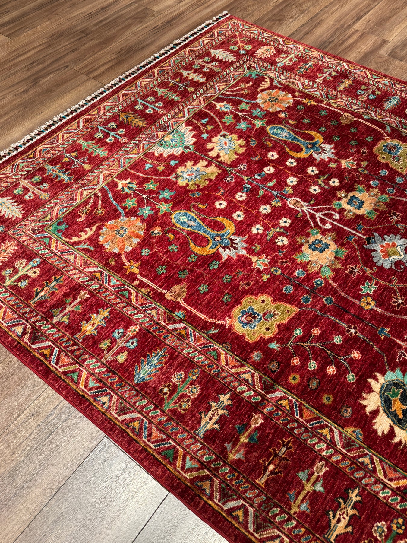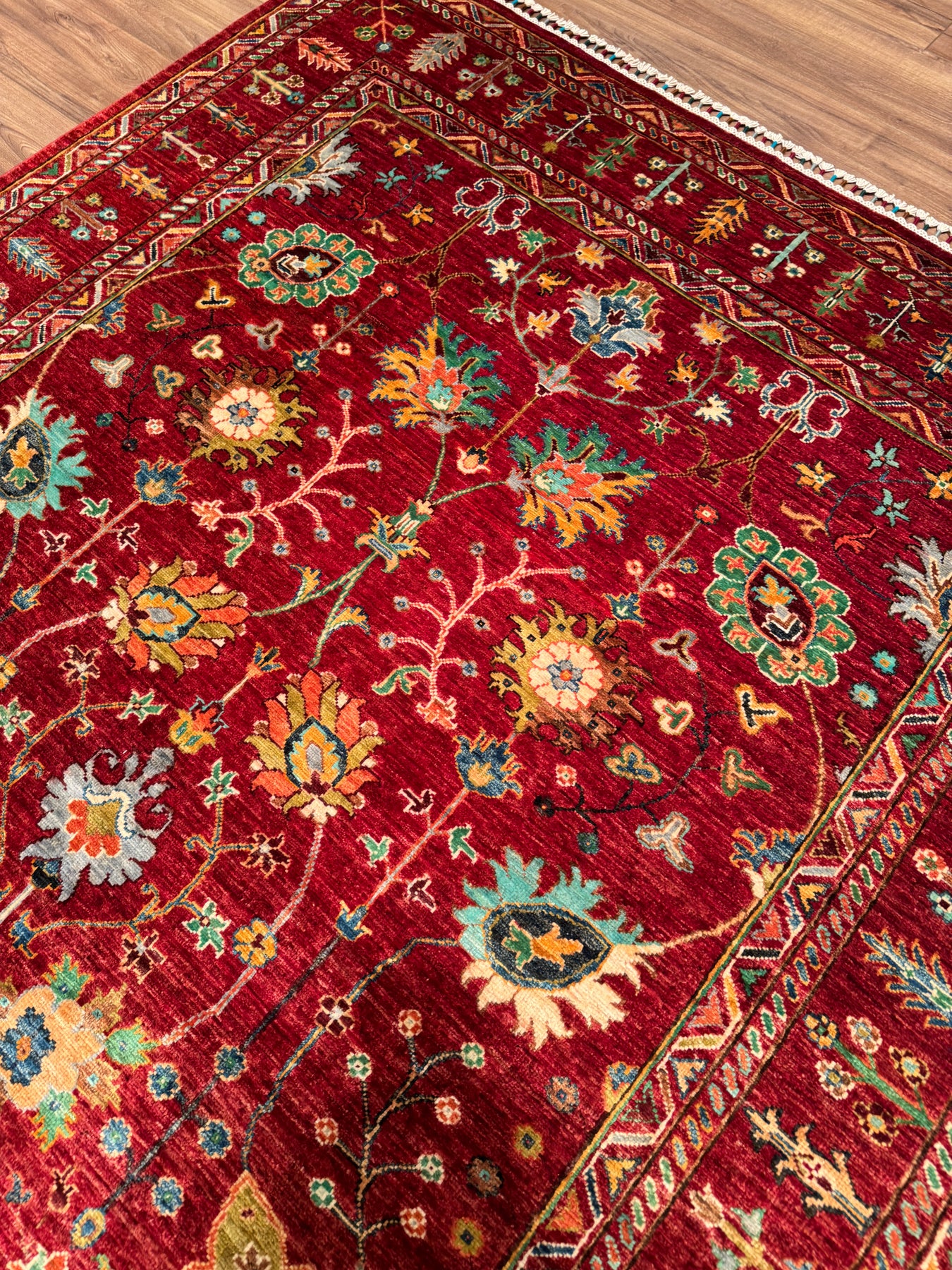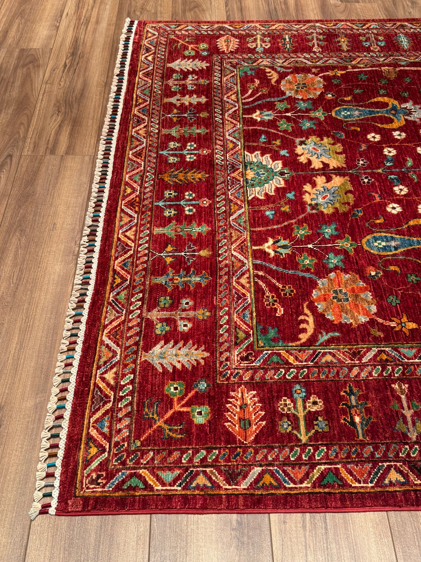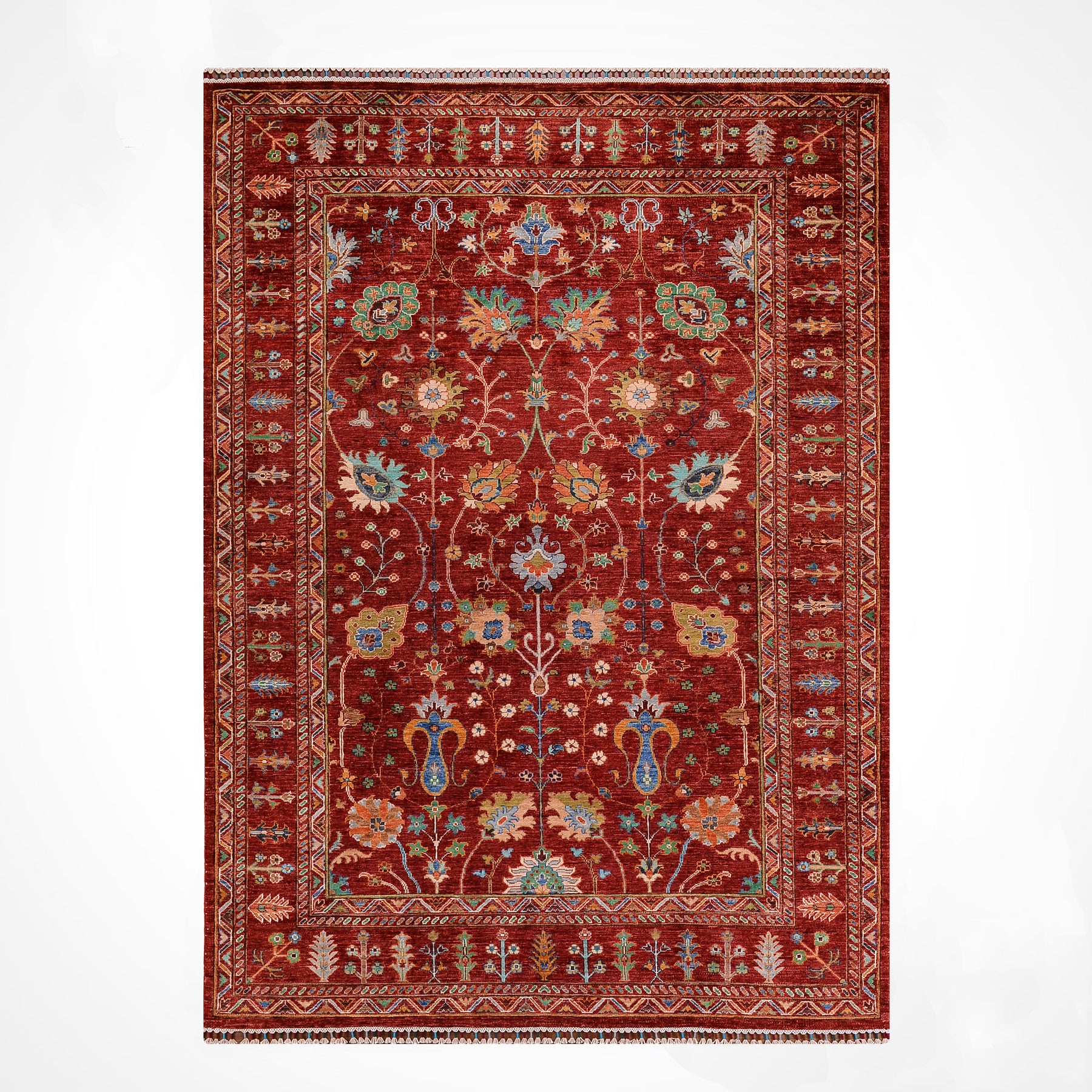 Bu halımızın atkı ve çözgüsü pamuk düğümleri yün ipliktir. İplikler de tamamen el ile kirman kullanılarak üretilmiştir. Düğümlerde kullanılan yün iplikler kök boya, yani doğal malzemeler, kullanılarak boyanmıştır. Örnek vermek gerekirse, kırmızı rengi elde etmek için yün iplikler gül yaprakları ile kaynatılır ve iplik gül yaprağının rengini alır; bu şekilde boyanmış ipliklere ise kök boya ile boyanmış iplikler denir. Kök boya ile boyanmış ipliklerden üretilen halılar, kullandıkça daha parlak bir görünüme sahip olur. Öte yandan, bu halımız dokuma sıklığı açısından üst kalite bir halı olup Türk düğümü bir diğer değişle çift düğüm tekniği ile dokunmuştur; bu özelliği sayesinde, daha dayanıklı olup İran halılarına kıyasla daha uzun ömre sahiptir.Son olarak, bu halımızın dokumasında yaklaşık 600.000 El düğümü atılmıştır.