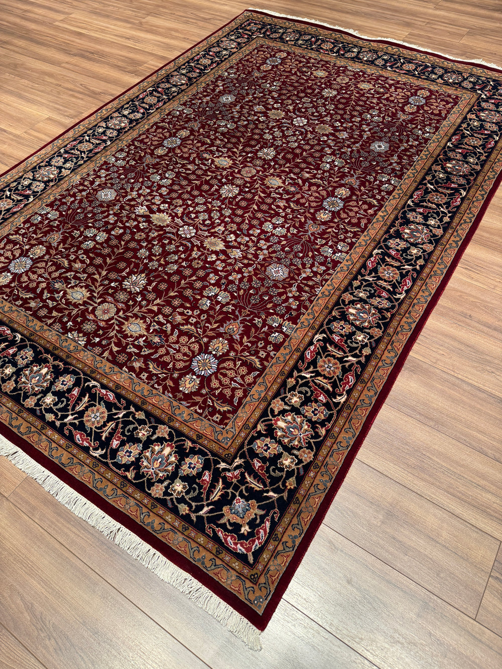The size of the living room rug should be compatible with your furniture and room size. A rug that is too small can get lost in the room; a rug that is too large can be overwhelming. The general rule is that the front legs of the chairs should be on the rug, with the rug under the seating group. This provides both integrity and defines the area.