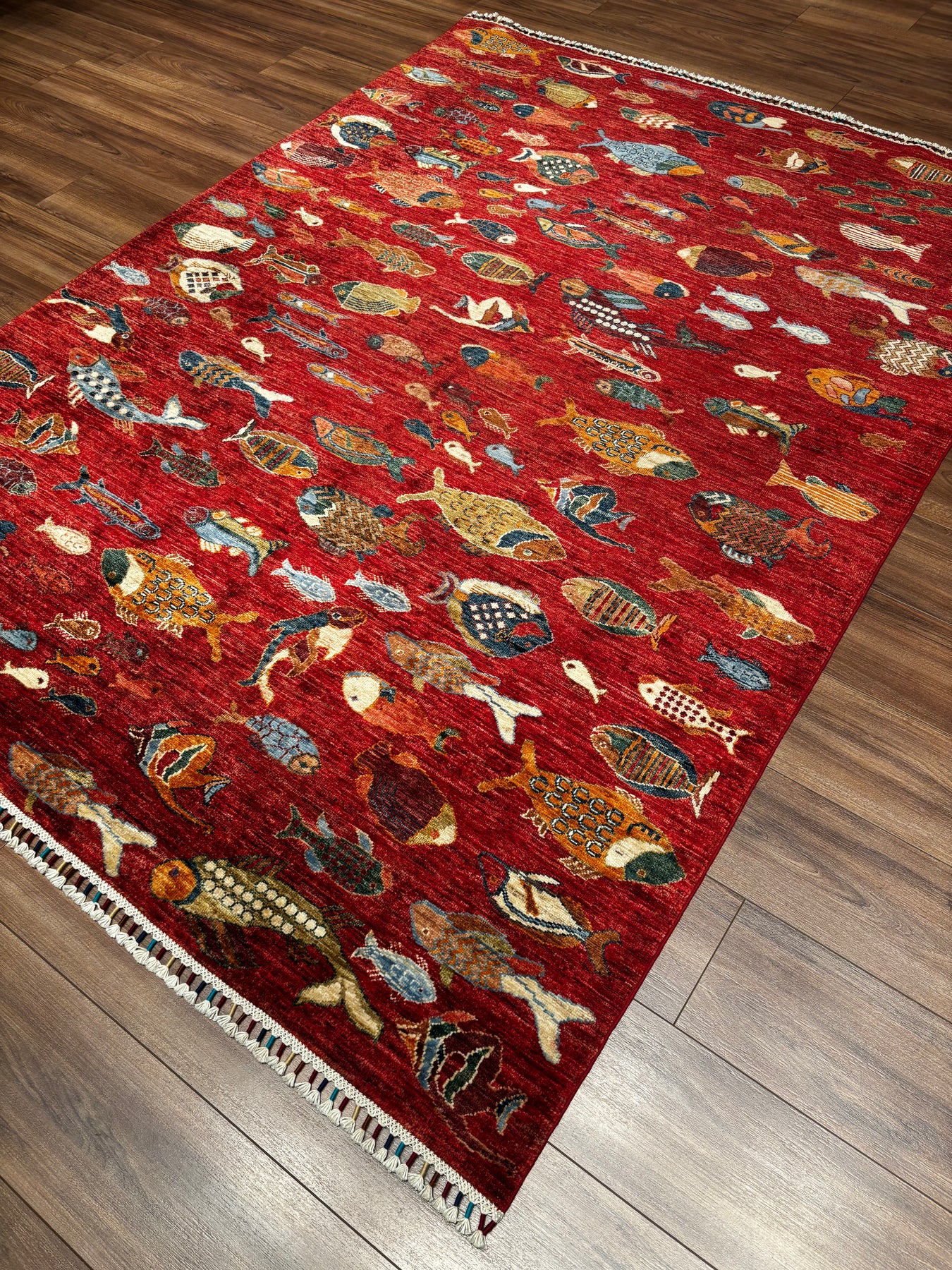 Balık Orijinal El Dokuması Kırmızı Kök Boya Yün Halı 174x236 4.11 Metrekare - 6x8 ft