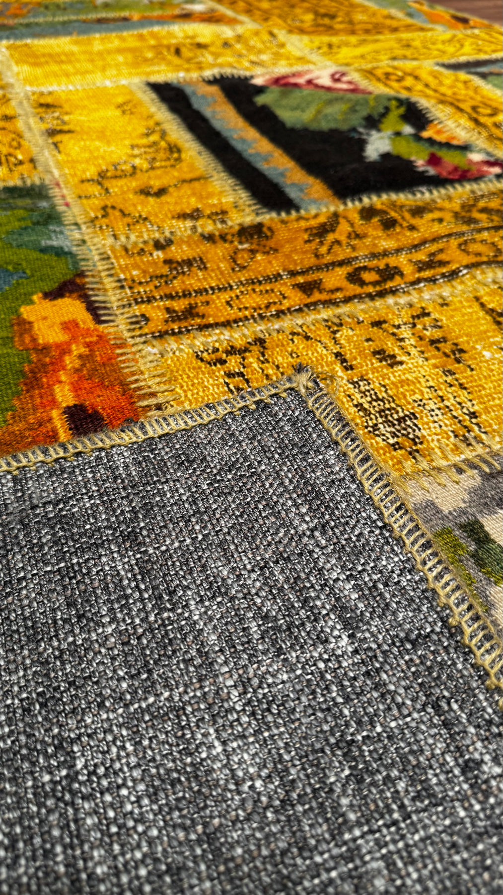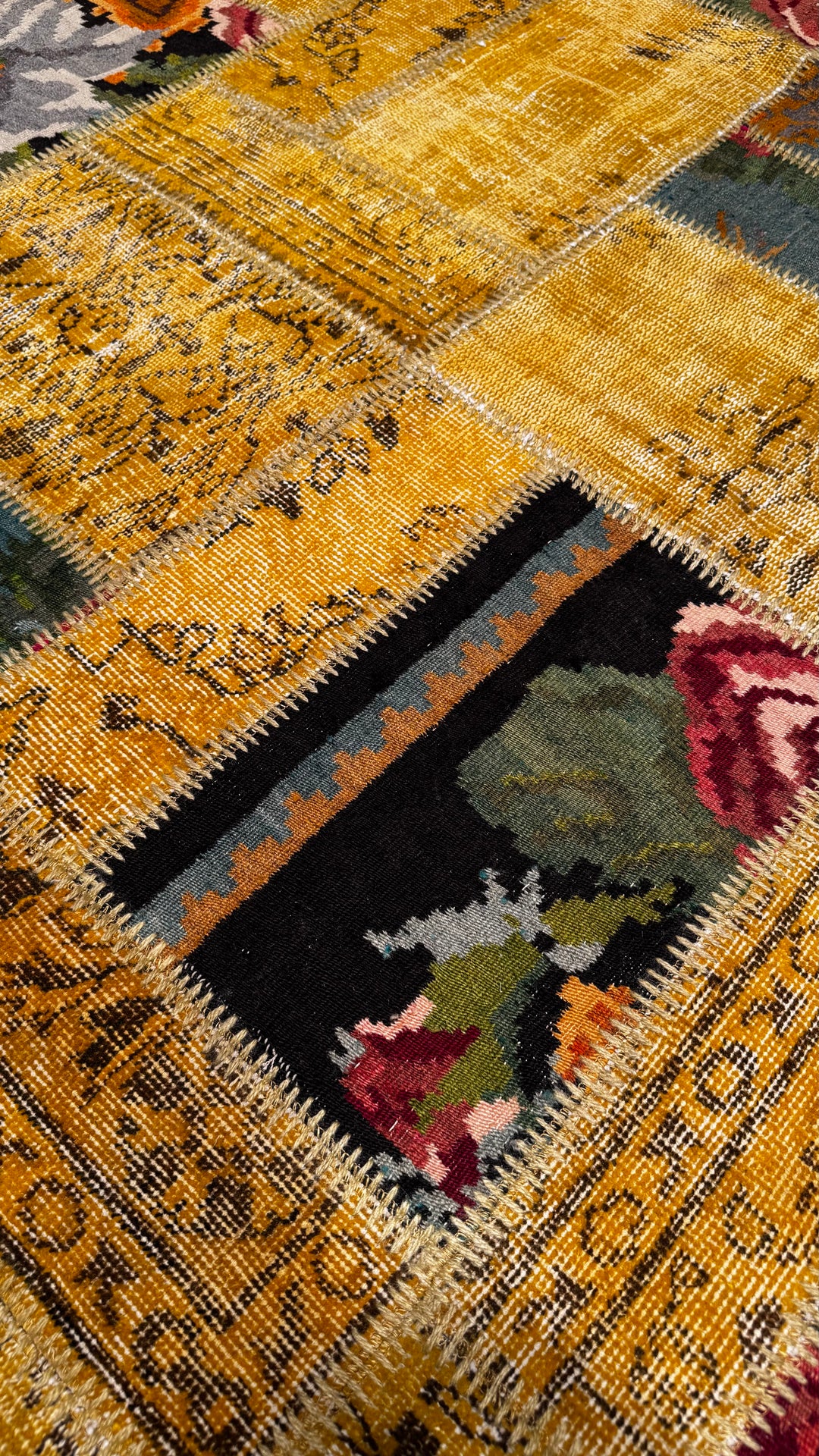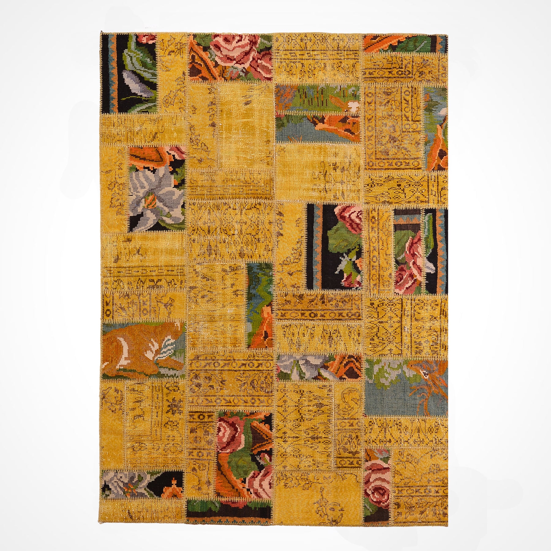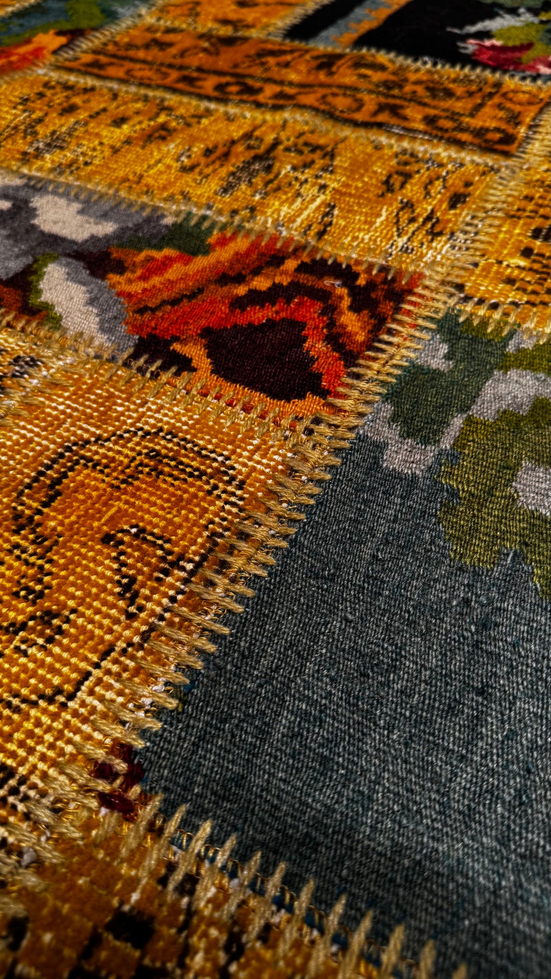 Original patchwork carpets are made by cutting old hand-woven carpets. These carpets are usually of Anatolian, Iranian or Afghan origin and consist of pieces made of natural wool and cotton. The intact parts of the carpets that are unusable are selected and reassembled, thus creating a product that is both nostalgic and environmentally friendly.