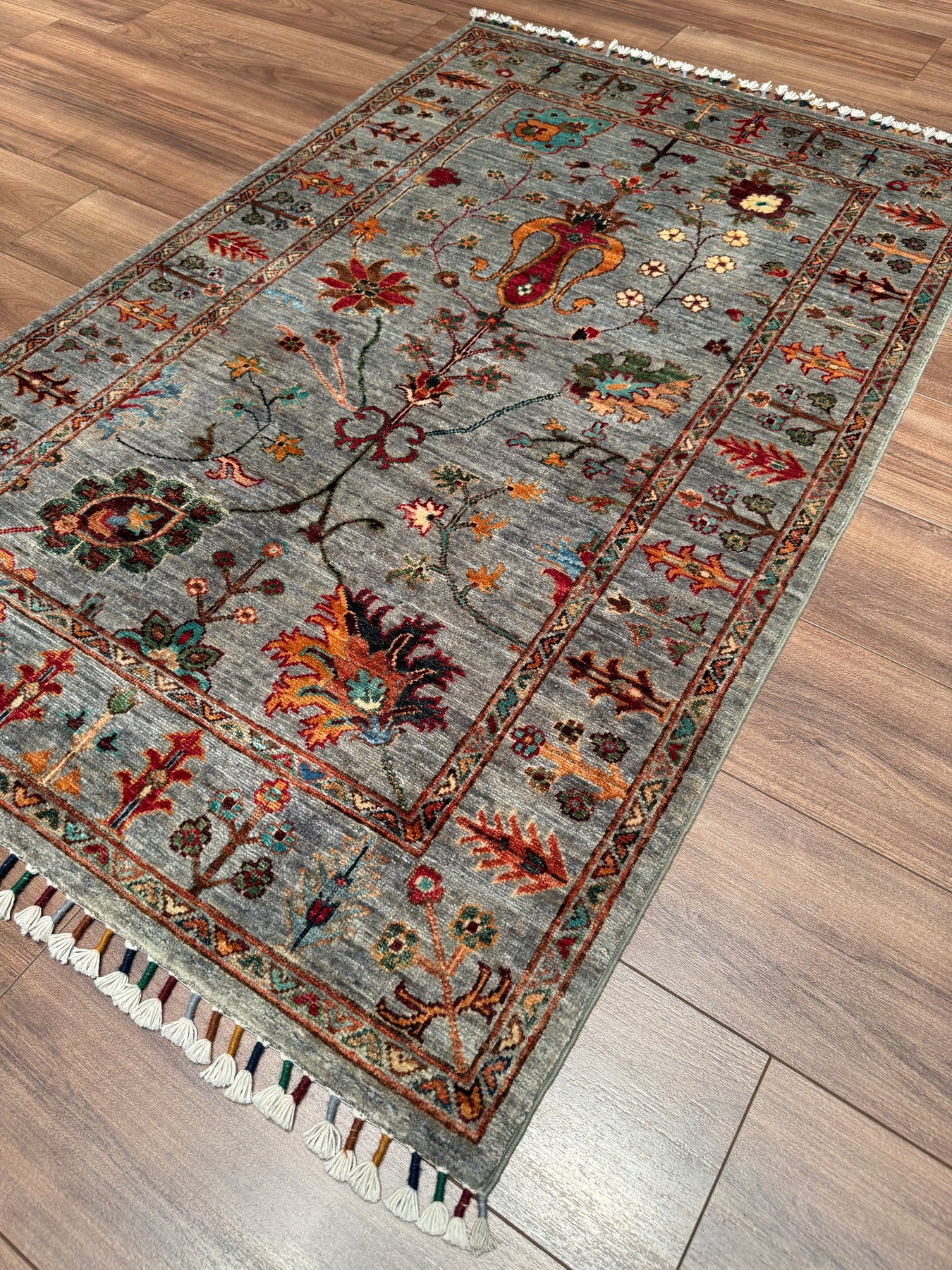 Sultani Çiçekli Orijinal El Dokuması Gri Kök Boya Yün Halı 0.99x153 1.51 Metrekare - 3x5 ft