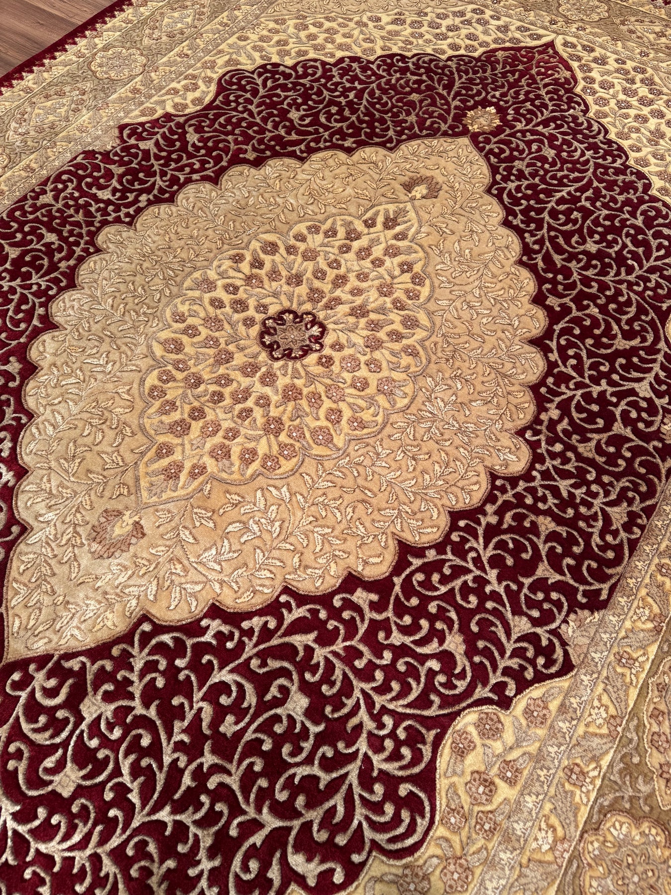 Bu halımızın atkı ve çözgüsü pamuk düğümleri yün ve bambu ipliktir. İplikler de tamamen el ile kirman kullanılarak üretilmiştir. Öte yandan, bu halımız dokuma sıklığı açısından üst kalite bir halı olup Türk düğümü bir diğer değişle çift düğüm tekniği ile dokunmuştur; bu özelliği sayesinde, daha dayanıklı olup İran halılarına kıyasla daha uzun ömre sahiptir. Son olarak, bu halımızın dokumasında yaklaşık 1.200.000 El düğümü atılmıştır.