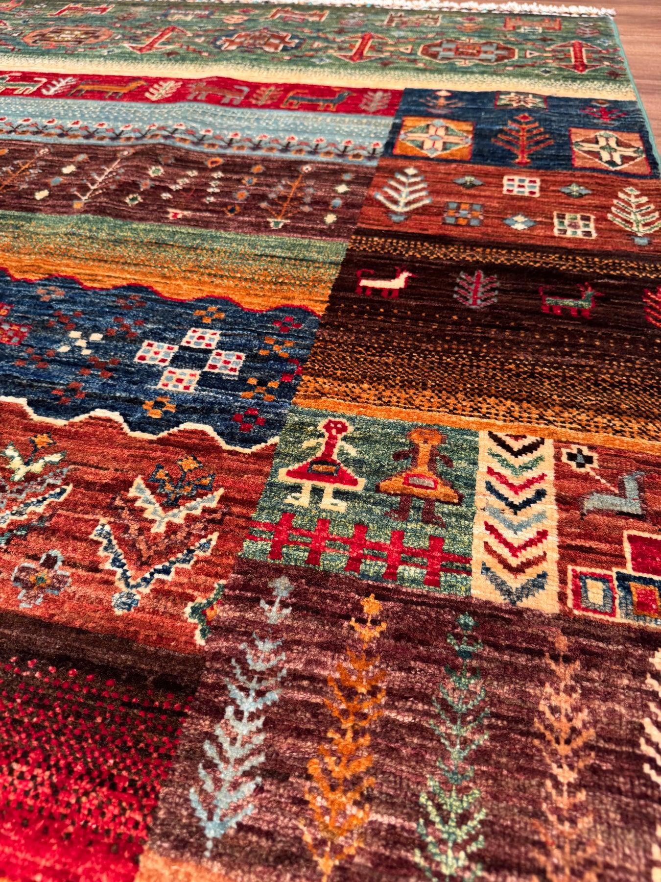 Bu halımızın atkı ve çözgüsü pamuk düğümleri yün ipliktir. İplikler de tamamen el ile kirman kullanılarak üretilmiştir. Düğümlerde kullanılan yün iplikler kök boya, yani doğal malzemeler, kullanılarak boyanmıştır. Örnek vermek gerekirse, kırmızı rengi elde etmek için yün iplikler gül yaprakları ile kaynatılır ve iplik gül yaprağının rengini alır; bu şekilde boyanmış ipliklere ise kök boya ile boyanmış iplikler denir. Kök boya ile boyanmış ipliklerden üretilen halılar, kullandıkça daha parlak bir görünüme sahip olur. Öte yandan, bu halımız dokuma sıklığı açısından üst kalite bir halı olup Türk düğümü bir diğer değişle çift düğüm tekniği ile dokunmuştur; bu özelliği sayesinde, daha dayanıklı olup İran halılarına kıyasla daha uzun ömre sahiptir. Son olarak, bu halımızın dokumasında yaklaşık 900.000 El düğümü atılmıştır.